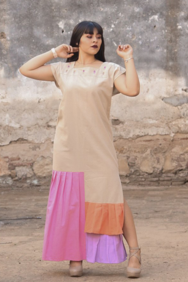 • Specification: Straight dress with asymmetrical flounces in three colors. It has slits on the sides, a square neckline with a traced piece, and embroidery with Medusa motifs.