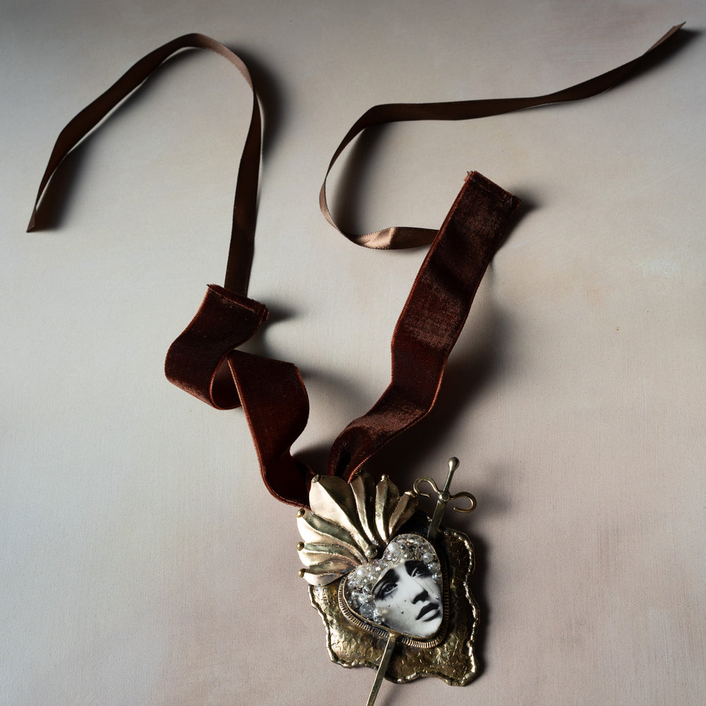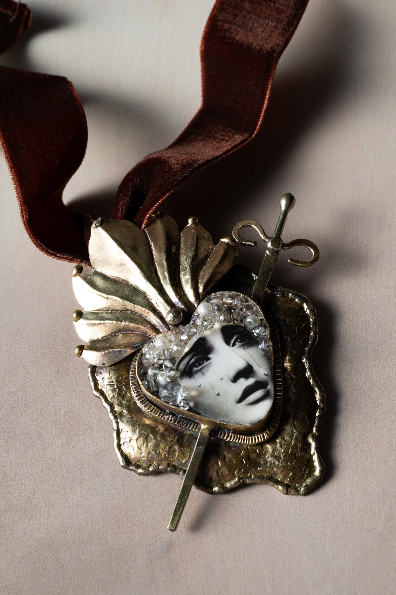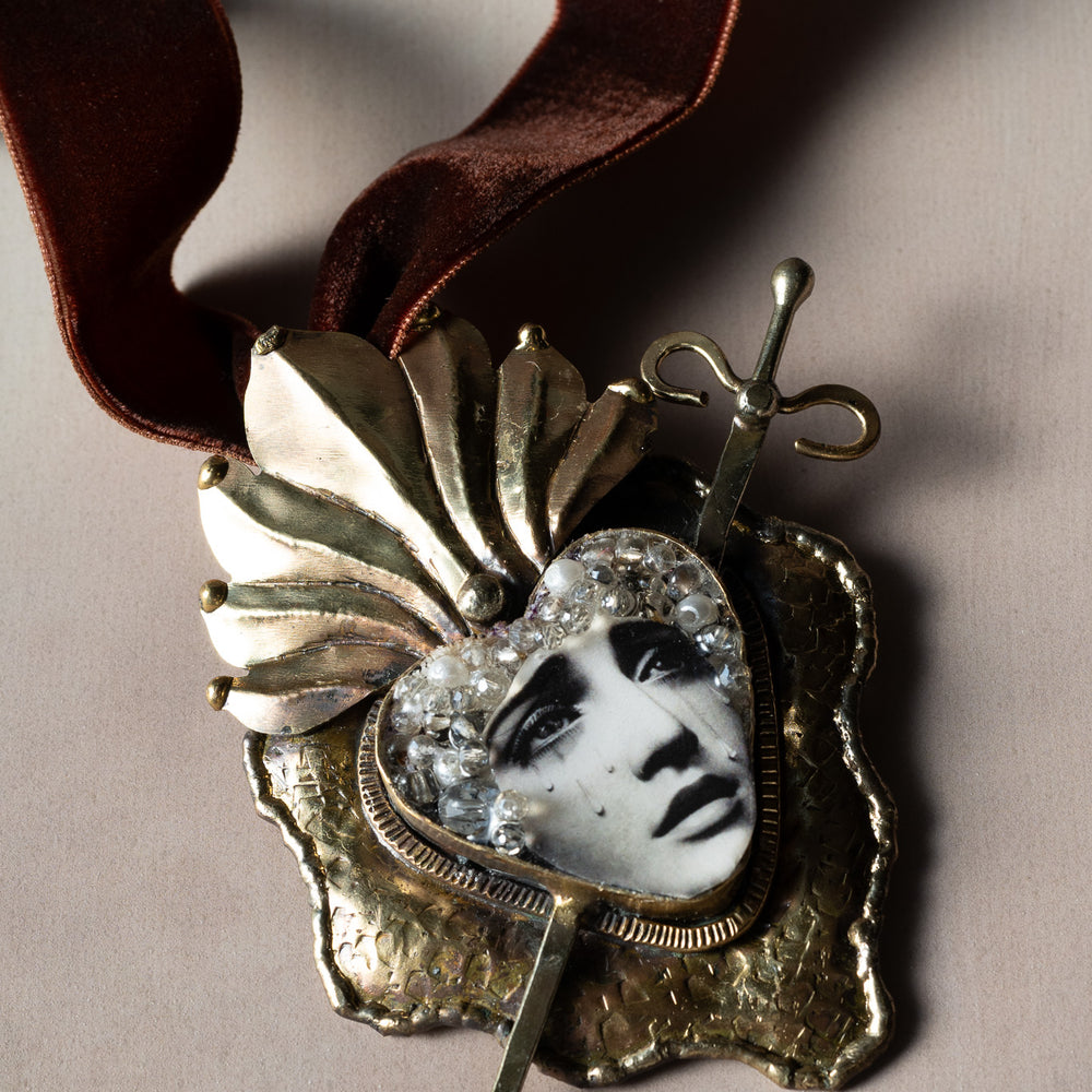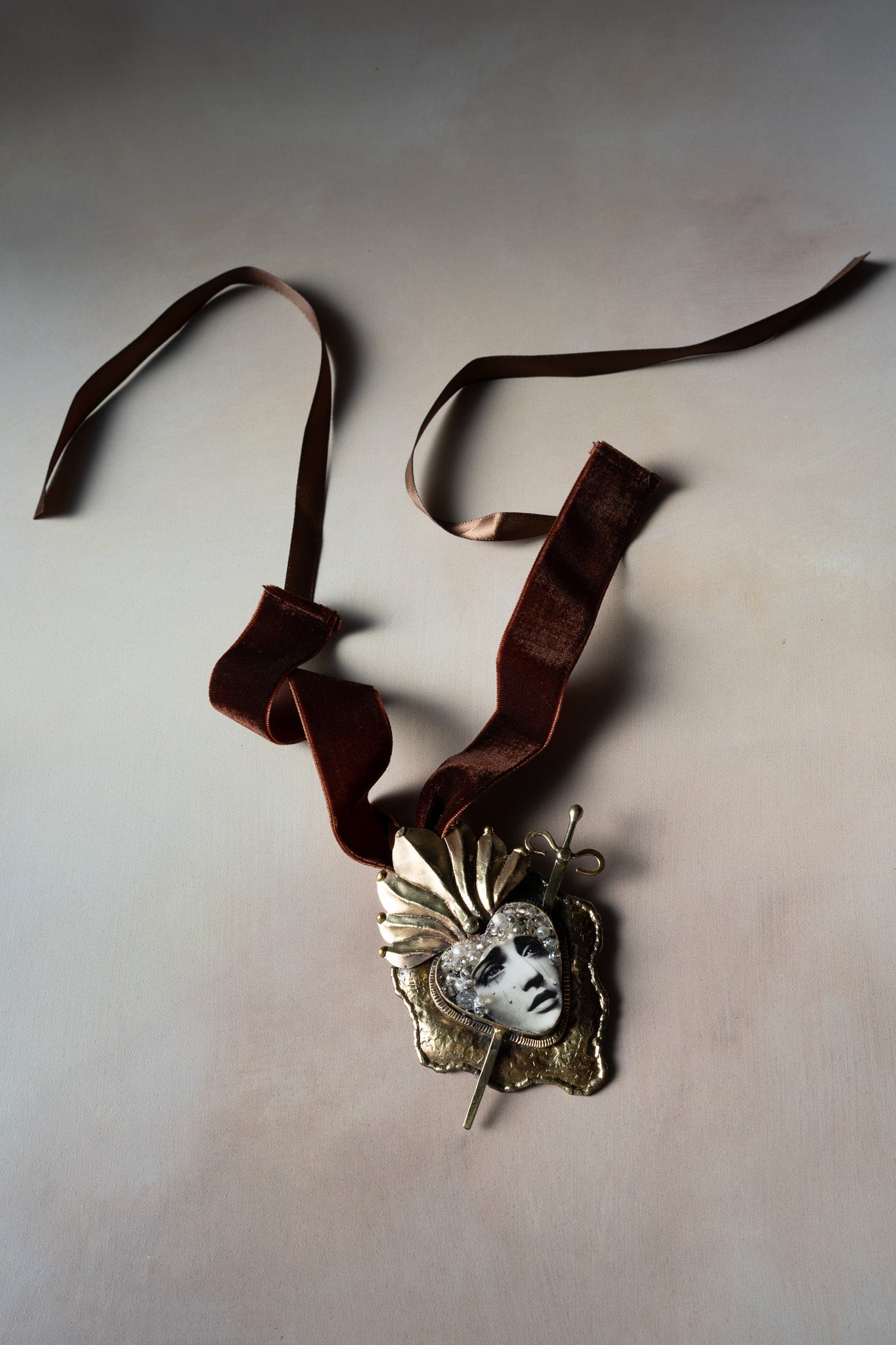 This collection of six handmade pieces honors Virgen de los Dolores—Our Lady of Sorrows—an enduring symbol of strength, compassion, and resilience. Crafted in collaboration with a goldsmith and a welder, each piece is shaped using the traditional martillado technique, where metal is hammered and chiseled by hand to reveal its final form. Encased with pearls and crystals, these heart-shaped relics embody both sacred devotion and the artistry of generations.