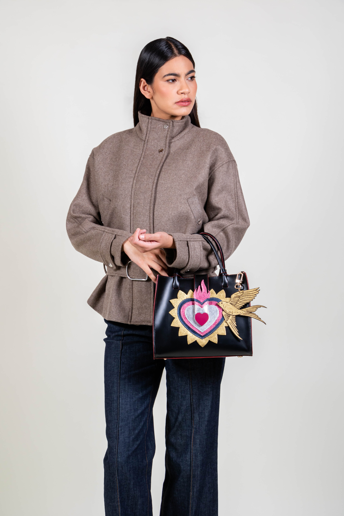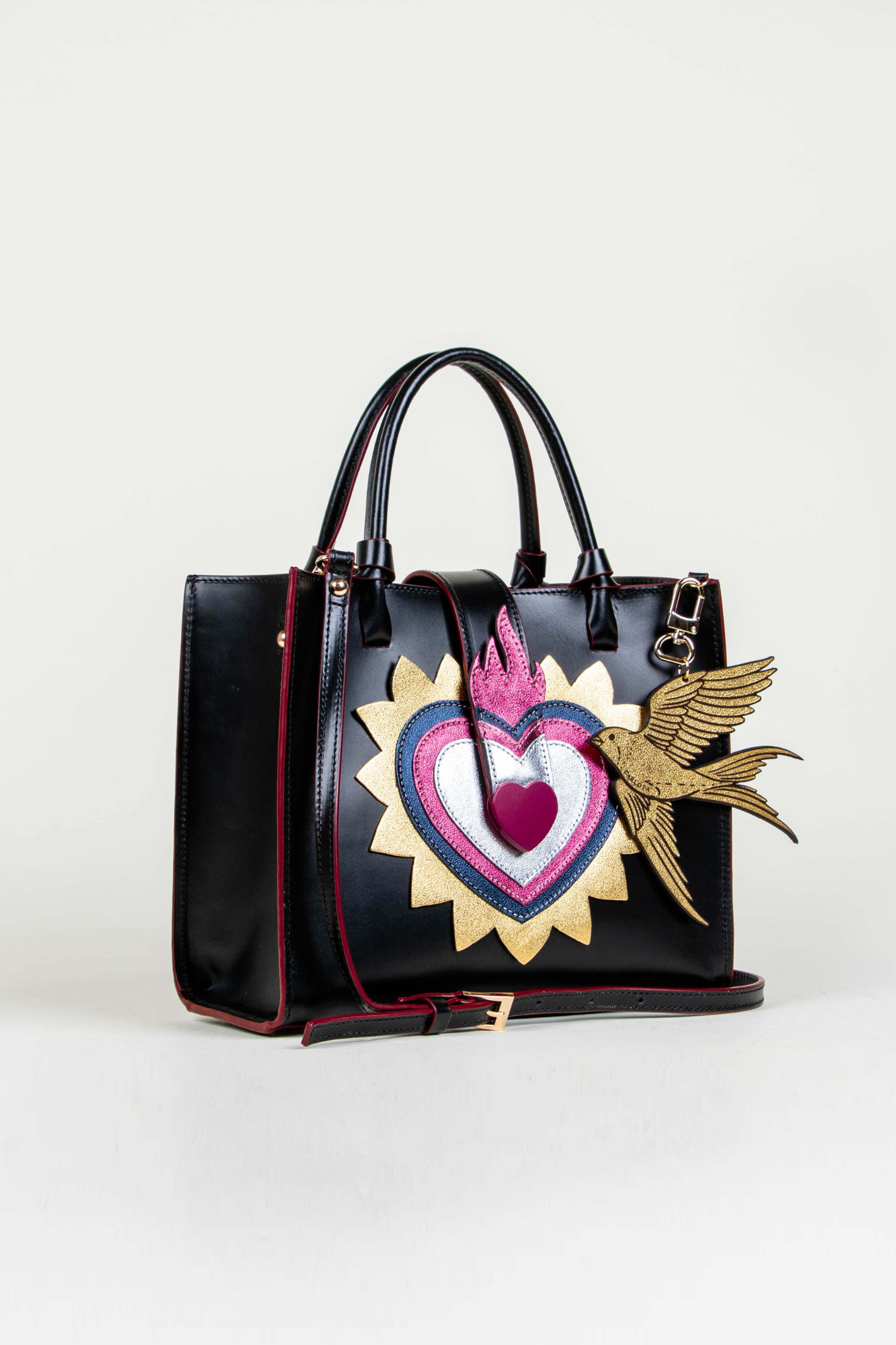 Inspired by El Corazón from the iconic Mexican lottery, this shoulder bag fuses heritage with contemporary design. Featuring a metallic heart inspired by Mexican milagritos, which symbolize dreams and wishes. A thoughtfully designed internal pocket keeps essentials organized, making it a practical choice for both casual outings and intimate gatherings. With dual handles for a classic hand-carry option and an adjustable strap, this versatile mini tote seamlessly combines style with functionality. The classic double-handle mini tote bag comes with a removable metallic bird charm and a magnetic snap closure.
