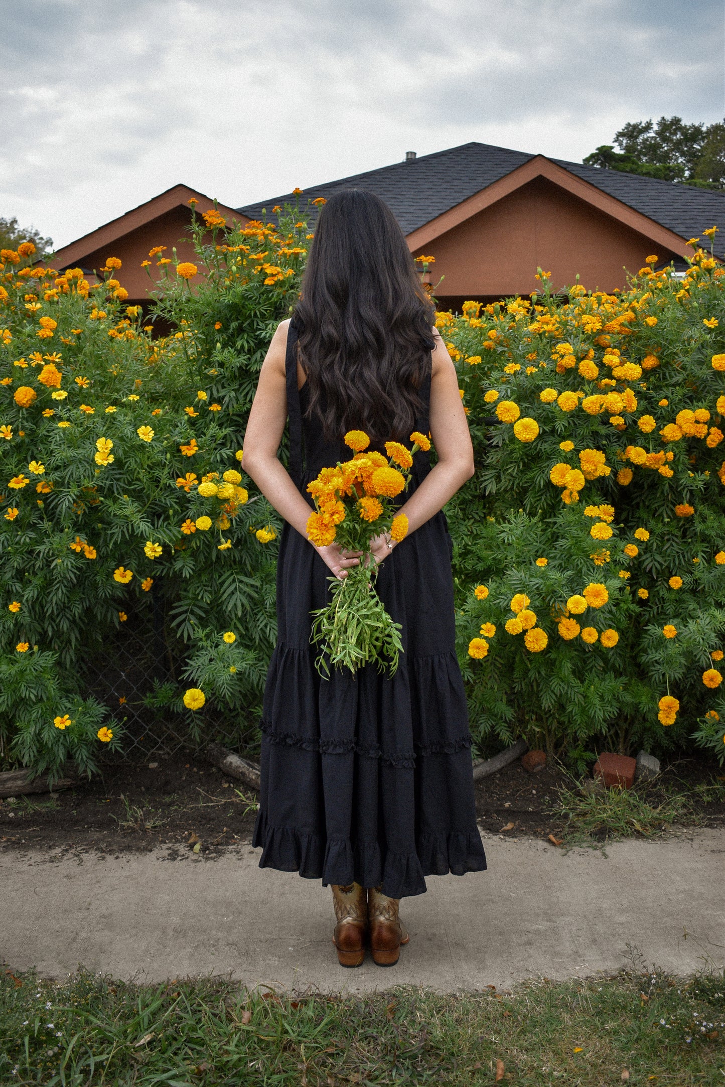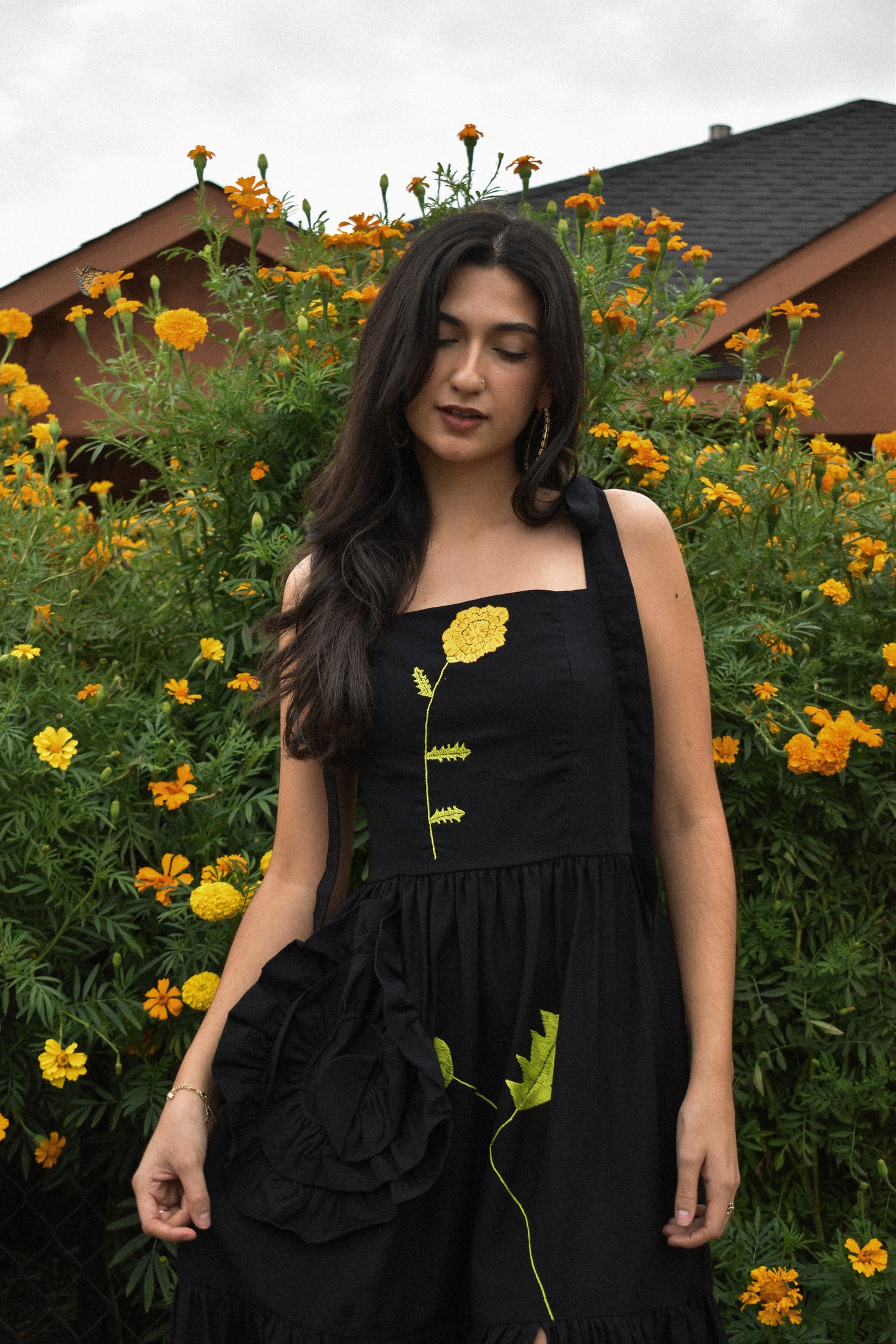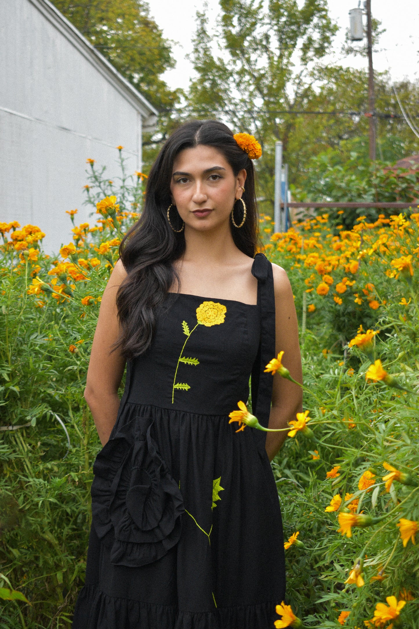Made from 100% natural cotton, the dress features a hand-embroidered marigold at the bust, meticulously rendered using houndstooth and chain stitch techniques. Two pleated ruffles cascade toward a side slit, adding graceful movement to the silhouette. The design is finished with shoulder ties that form soft bows — a subtle, romantic detail that balances structure and ease.