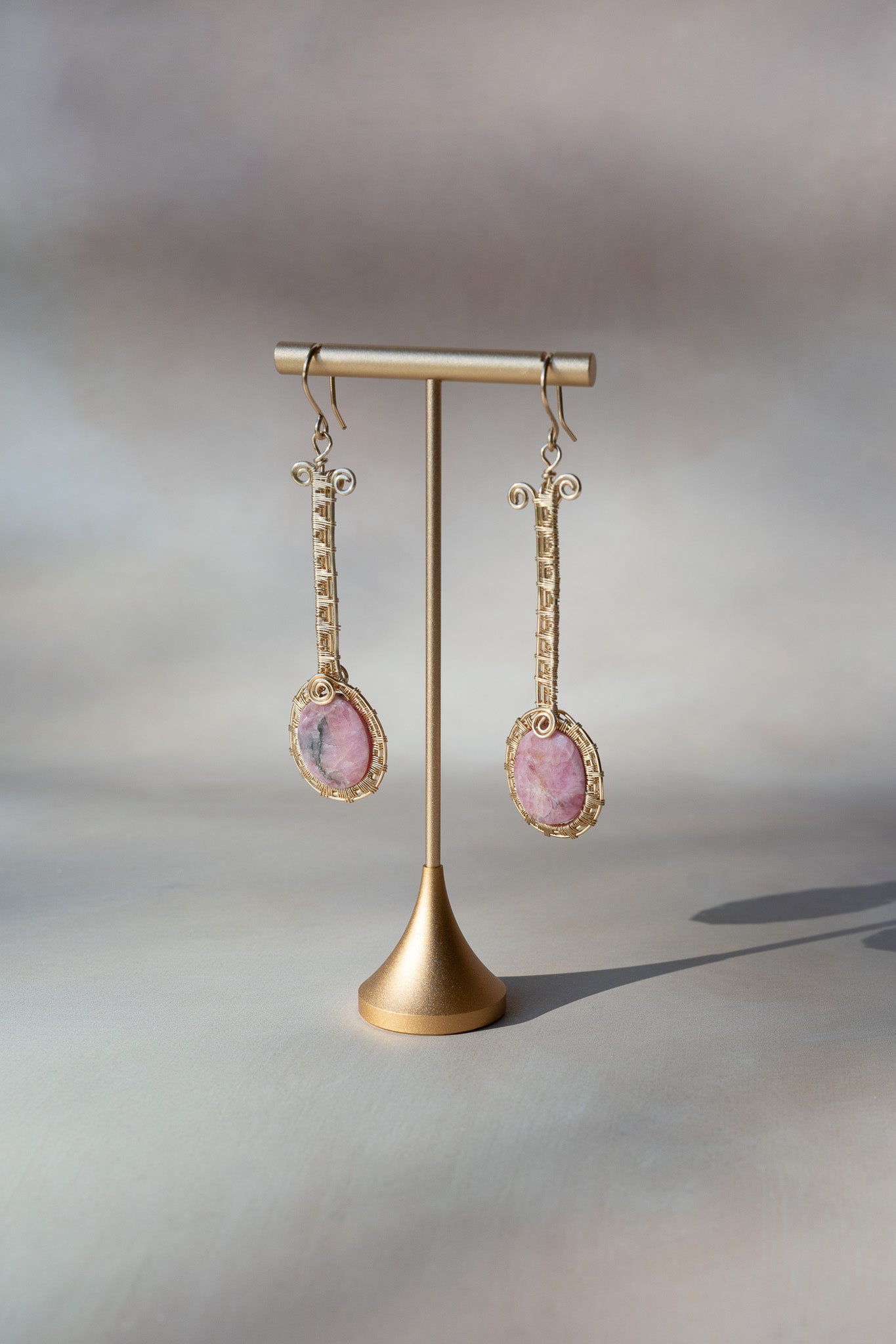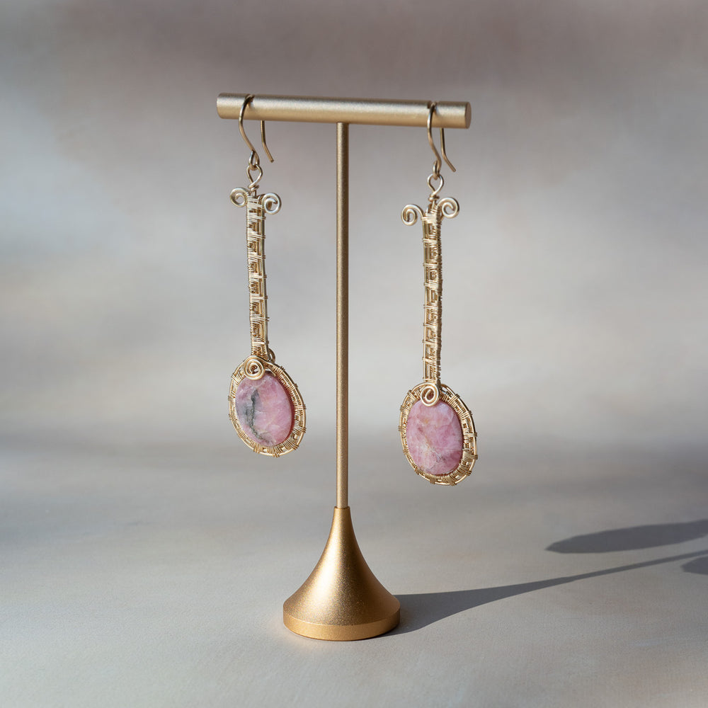 Sourced from the valleys of northern Mexico, these earrings feature the soft pink beauty of rhodonite, a stone celebrated for its grounding and nurturing energy. The oval-cut stones are framed in intricate gold-toned wirework, extending into a slender 3½-inch drop design that sways elegantly with movement.