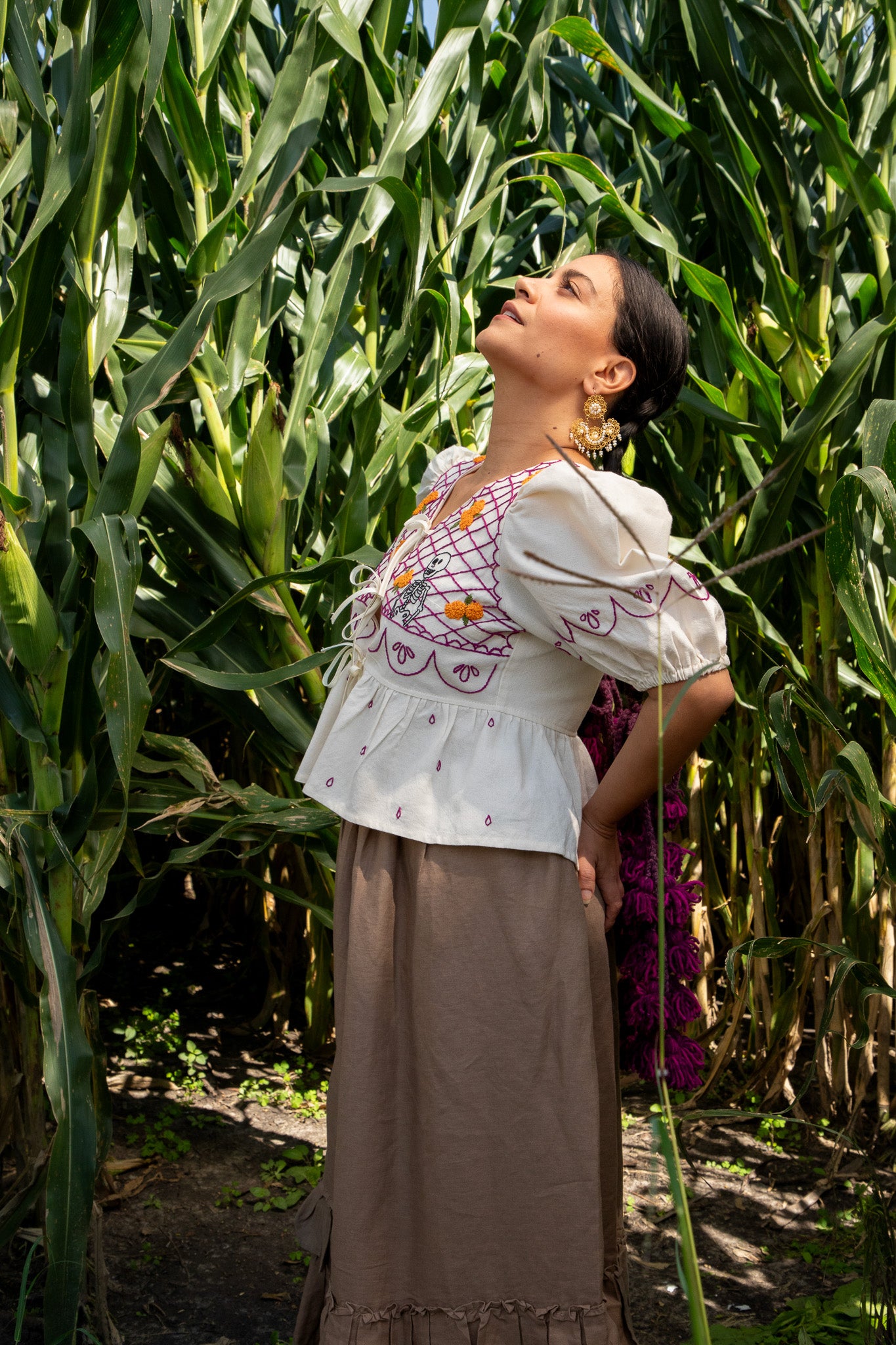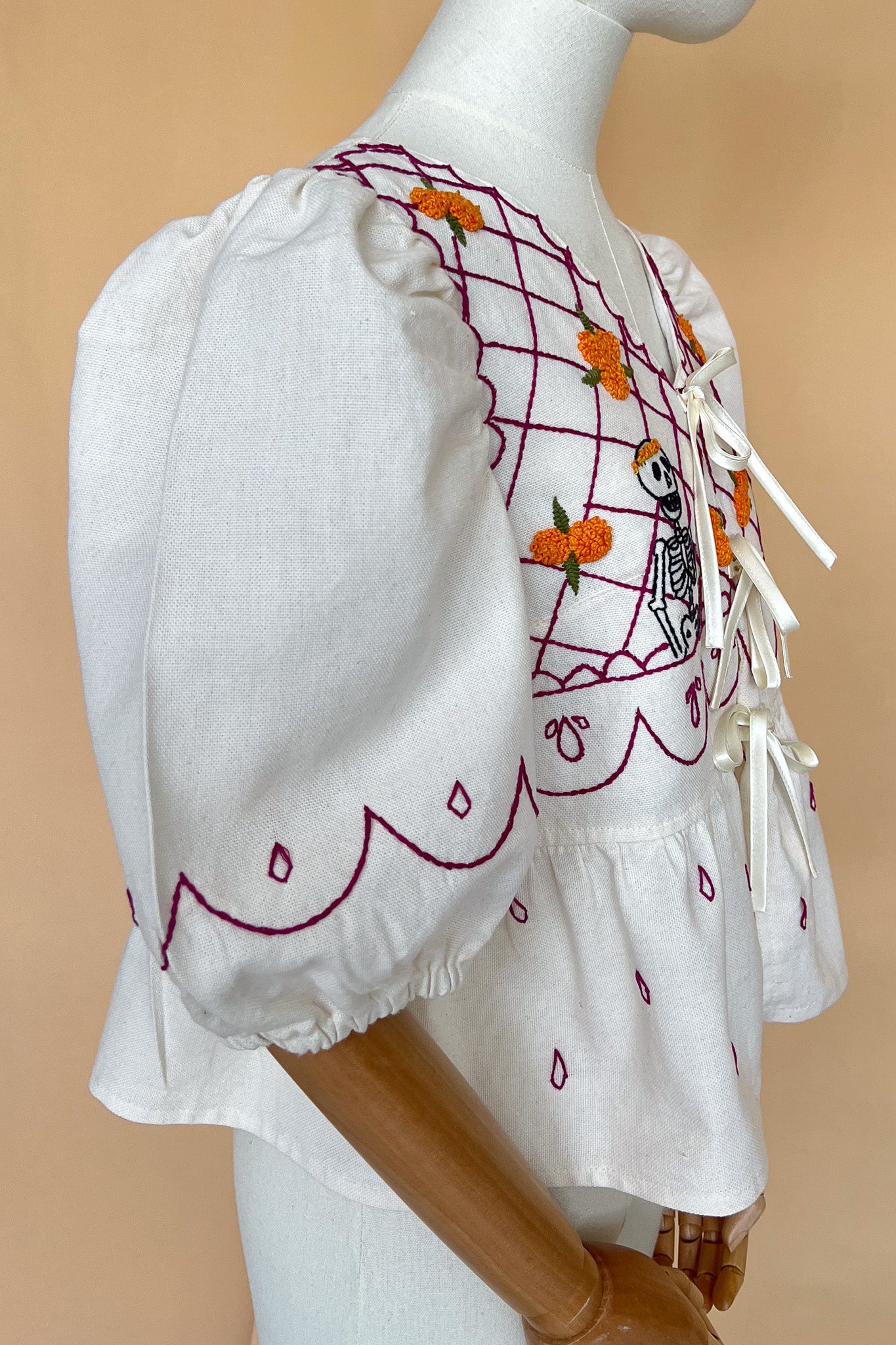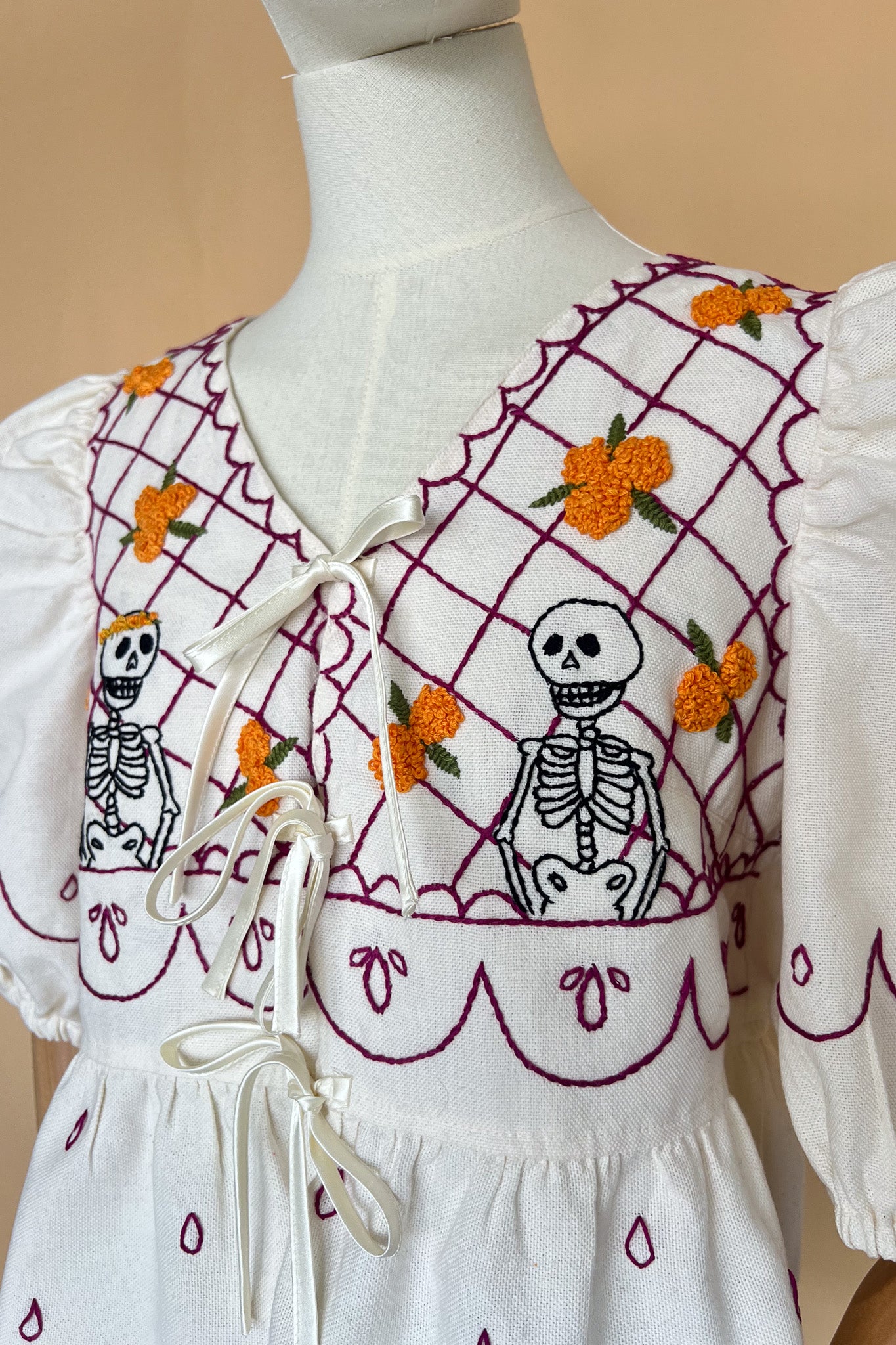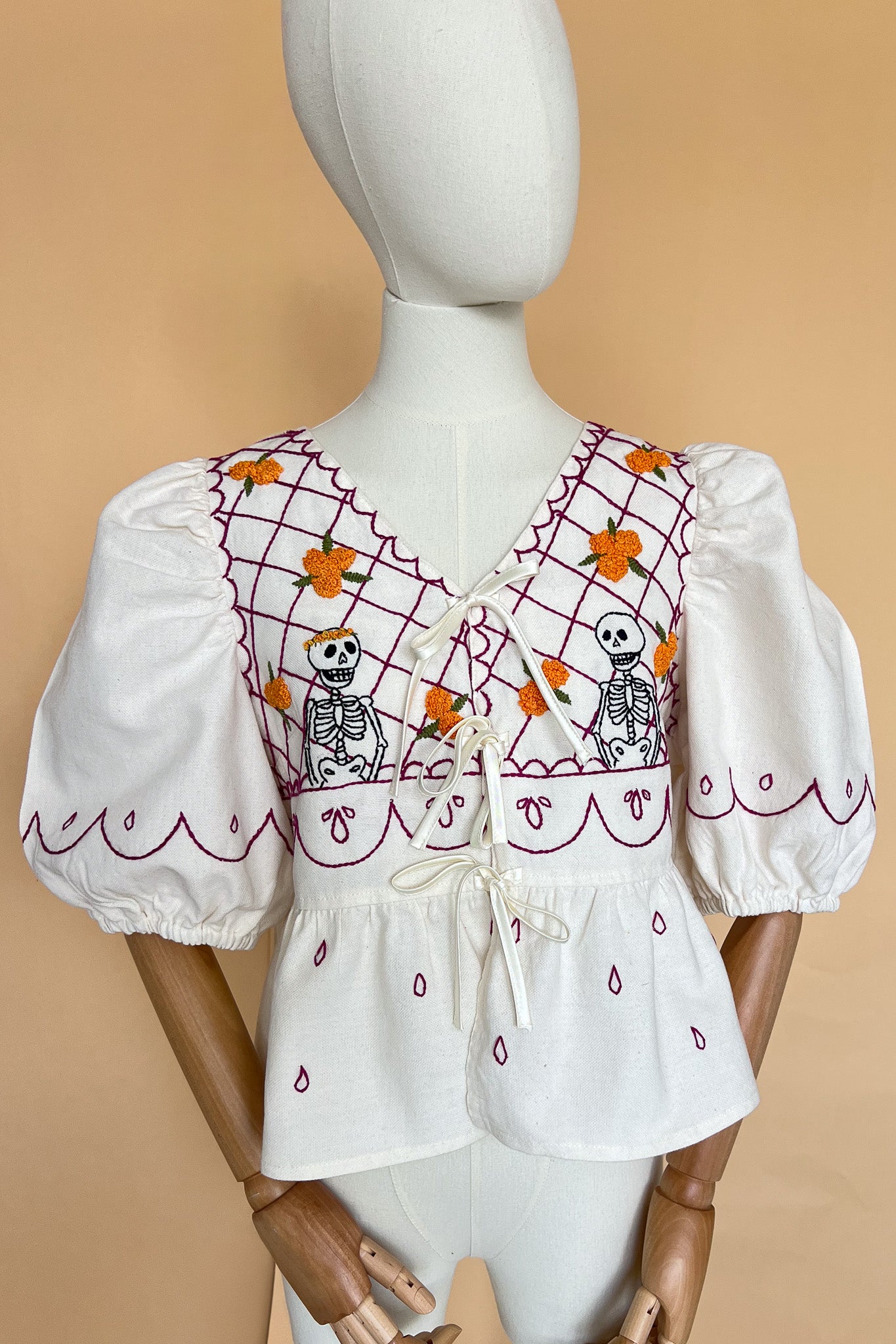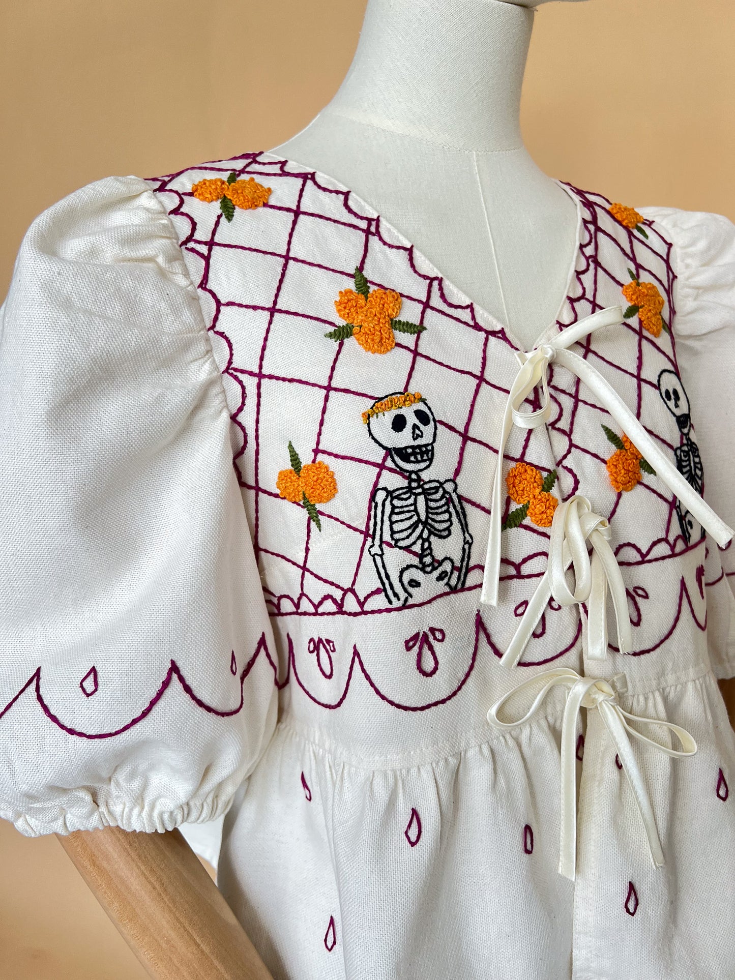 This beautiful top is handmade from natural cotton and woven on a traditional pedal loom. The artisans have delicately hand-embroidered intricate motifs of papel picado, skulls, and flowers using the detailed fill stitch technique, adding texture and depth to the design. Crafted with care by artisans in Michoacán, this design honors Mexico’s rich textile heritage and the enduring connection between tradition, memory, and expression.