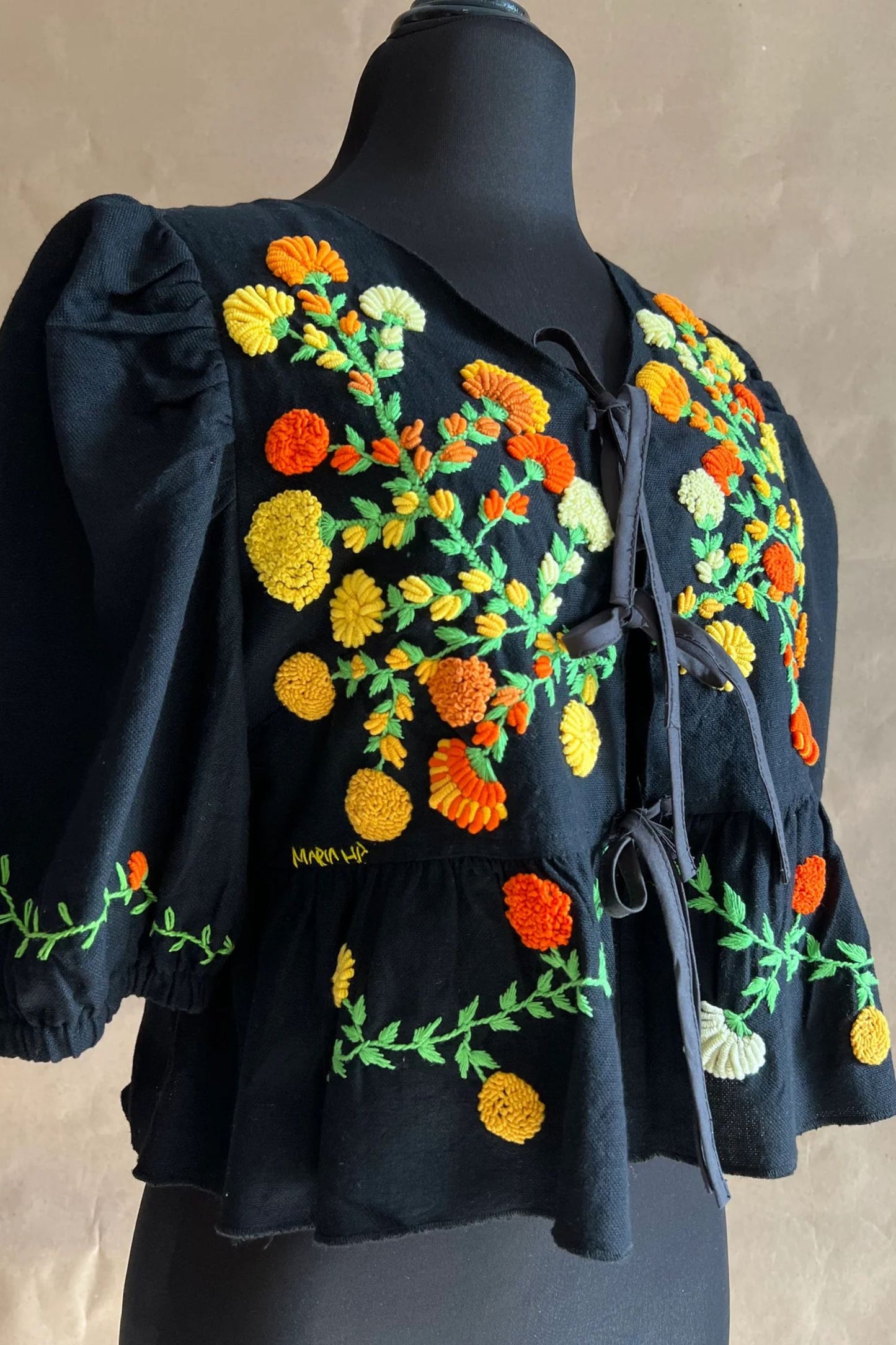 • Iconography: The embroidery showcases the cempasúchil flower, which is most famously associated with Día de los Muertos and symbolizes remembrance and the celebration of life.