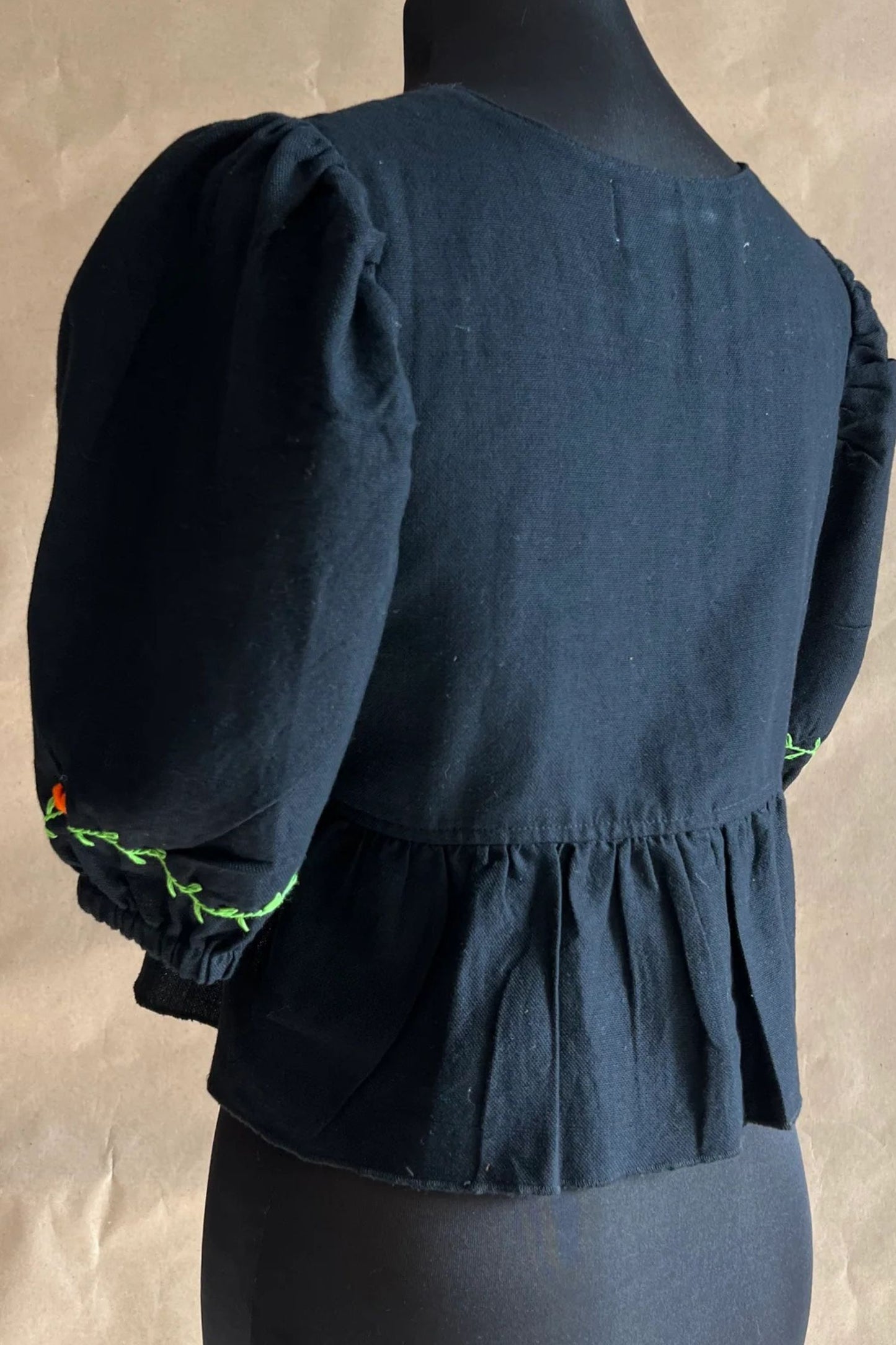 The creation of the Cempasúchil Top is a labor of love, involving meticulous craftsmanship and time-honored techniques. The process begins with one full week of weaving the fabric on a traditional pedal loom. This ancient technique requires skill and precision, as the loom is operated entirely by foot, allowing artisans to create tightly woven, durable fabric while maintaining full control over the design.