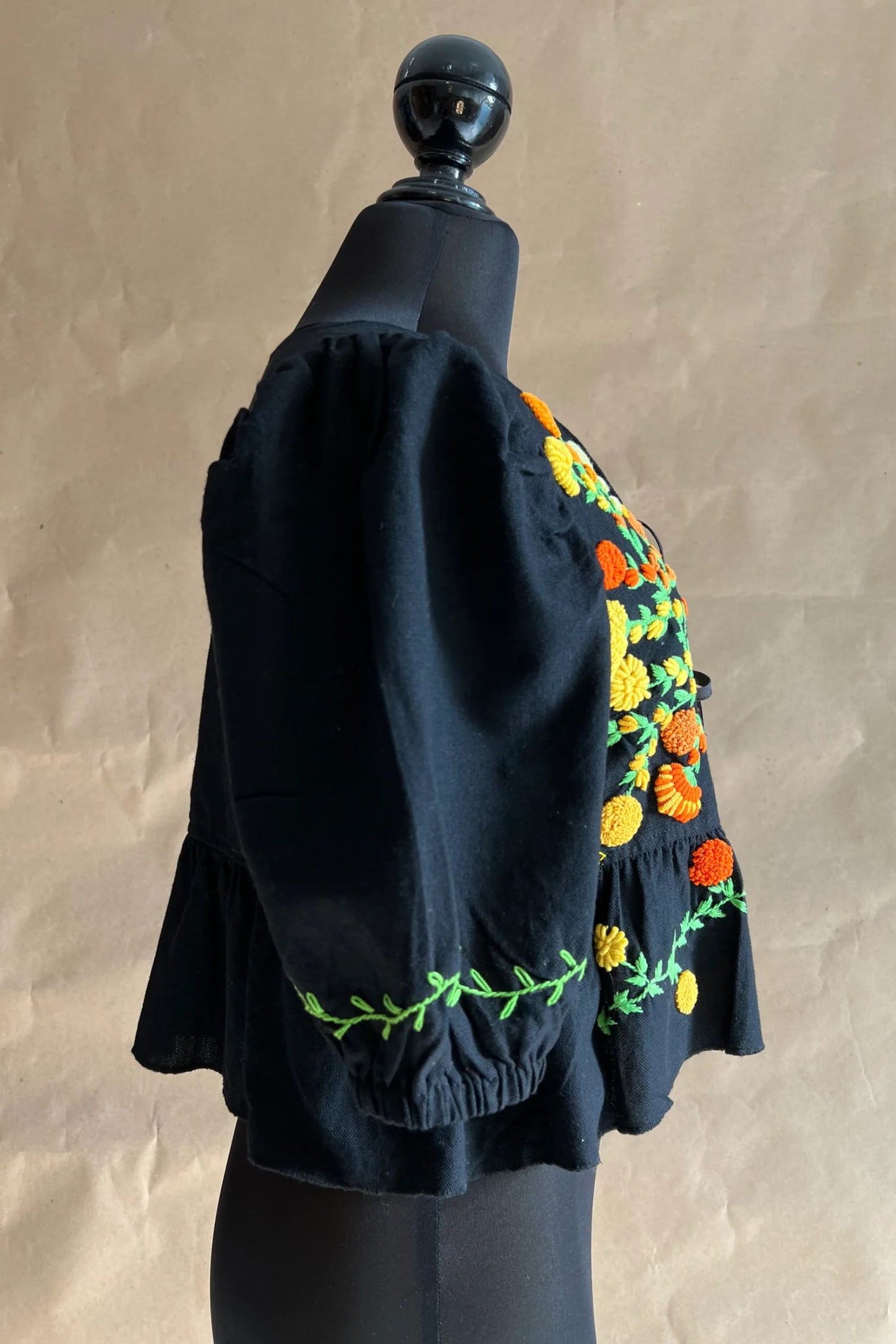 • Specification: Natural cotton top is woven on a traditional pedal loom, is hand-dyed and features hand-embroidered cempasúchil flowers delicately placed throughout the front