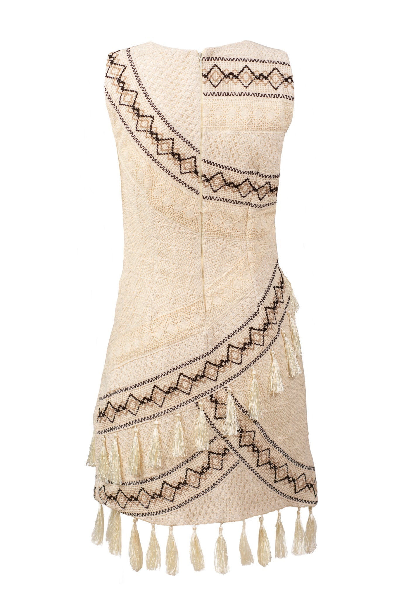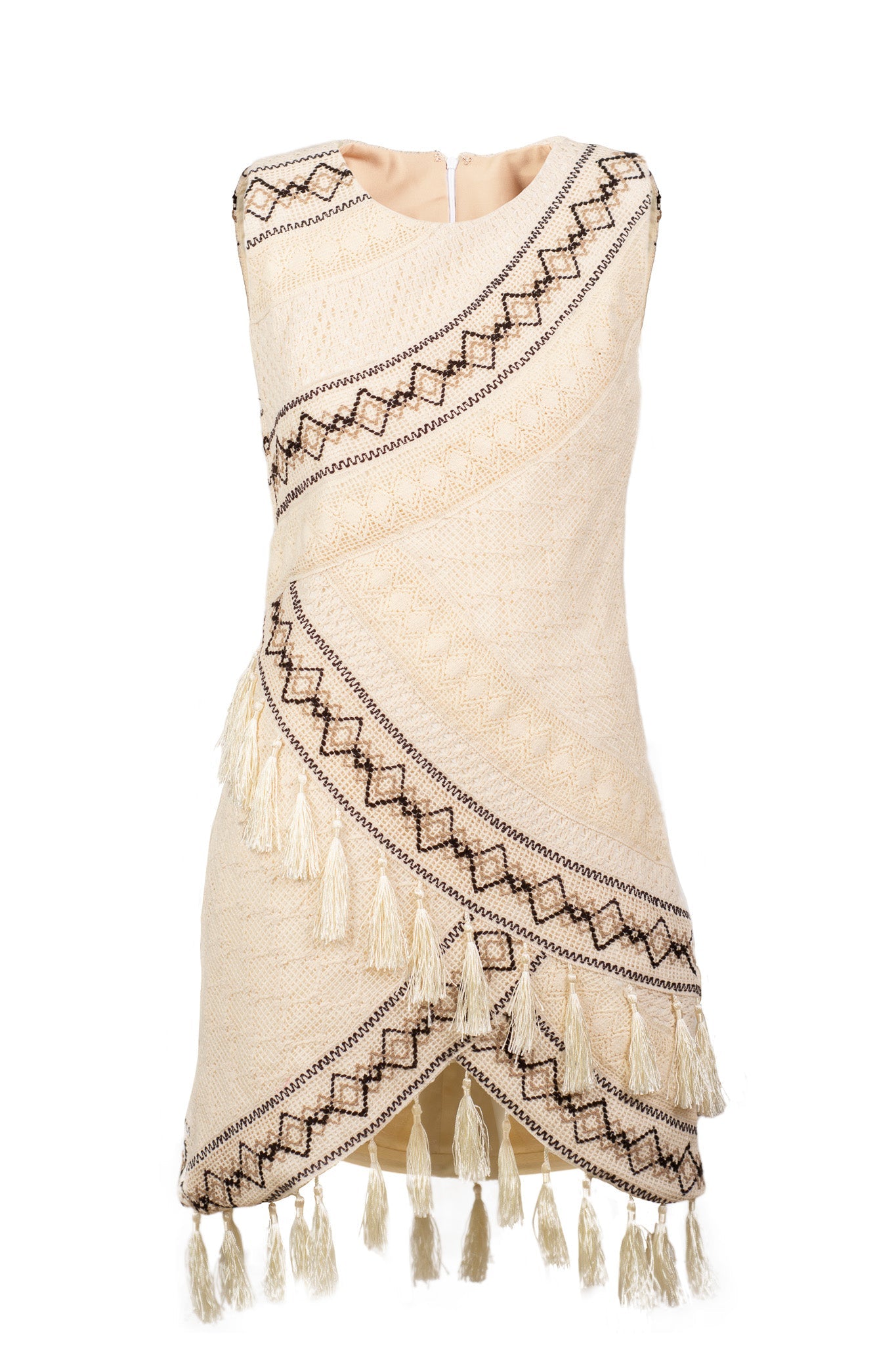 • Specification: Cotton dress, basic cut fitted to the body with tira de rejilla  embroidery, placed in a circular manner making a visual shape to accentuate the waist and hips, complemented with polyester thread beards.