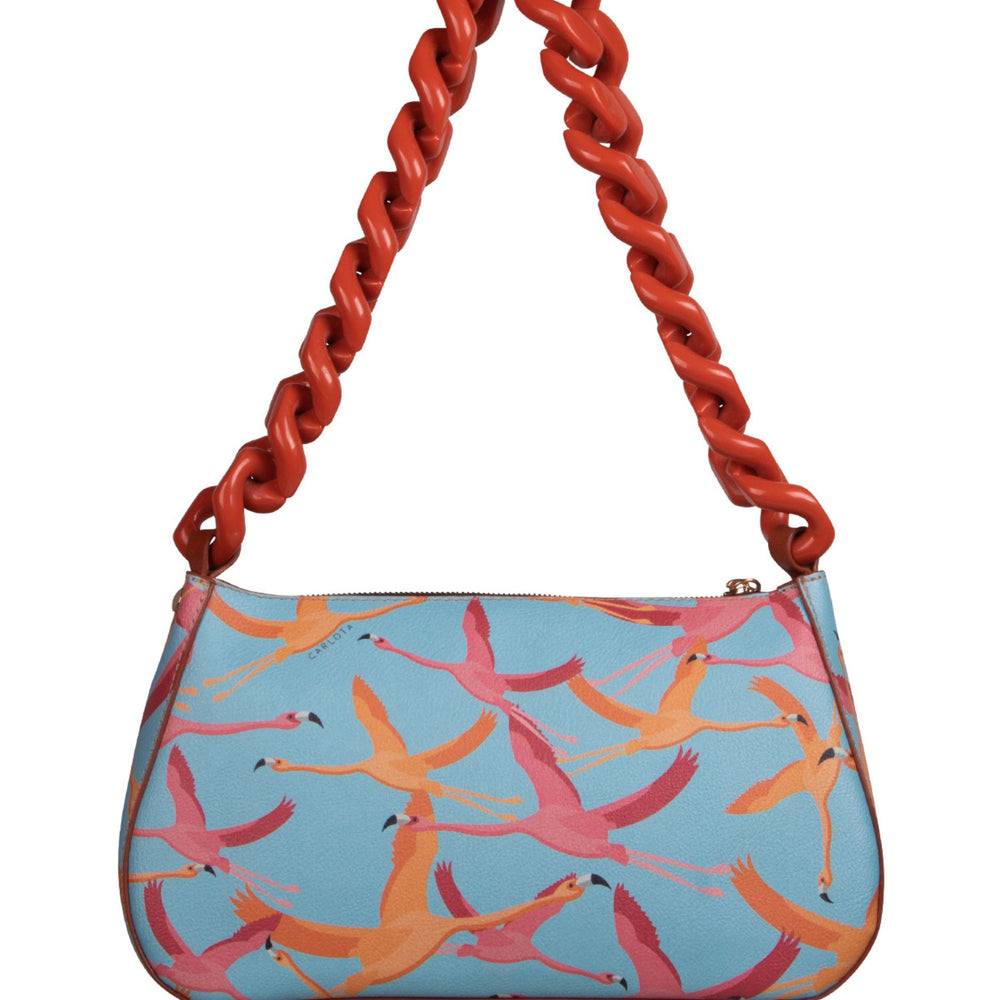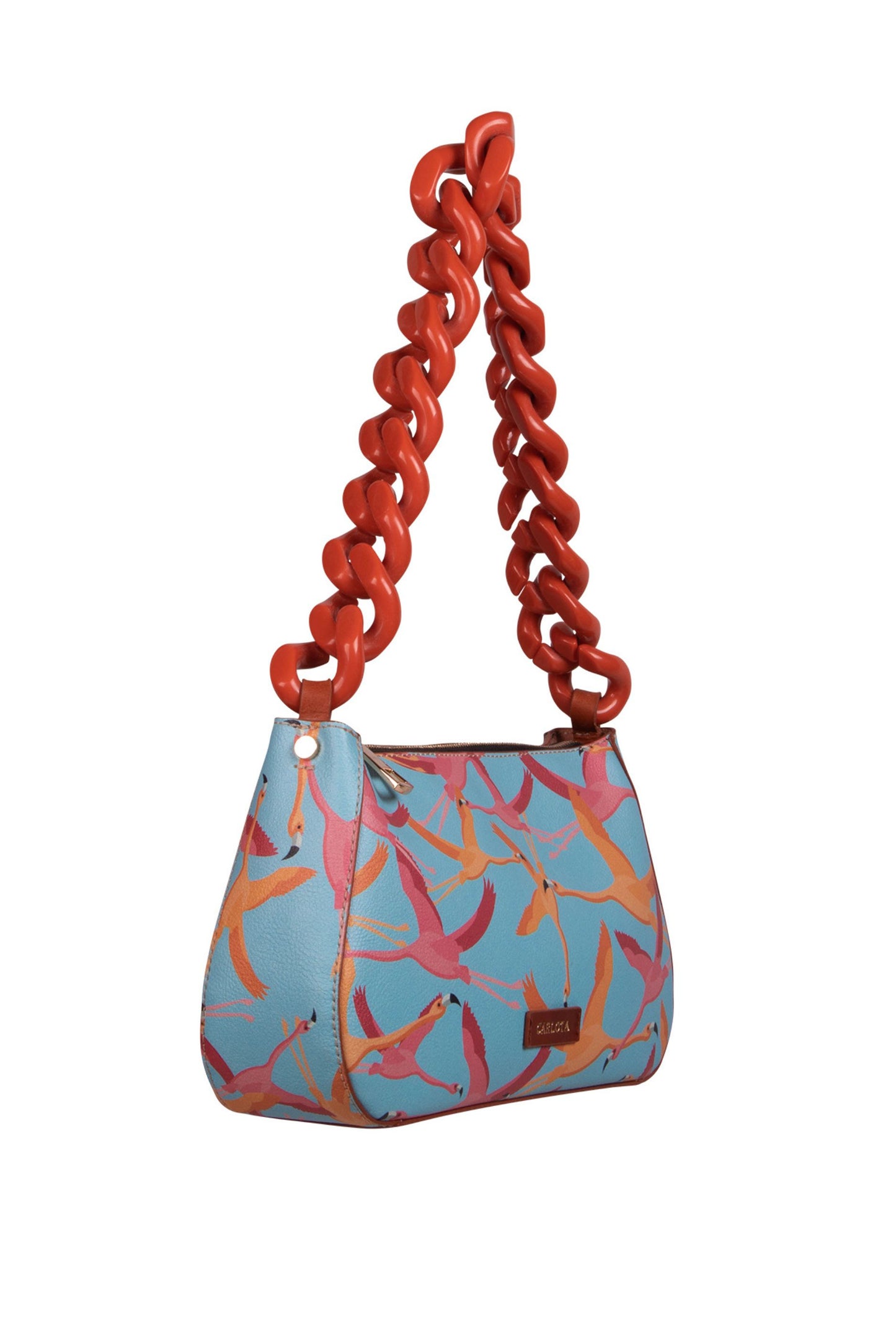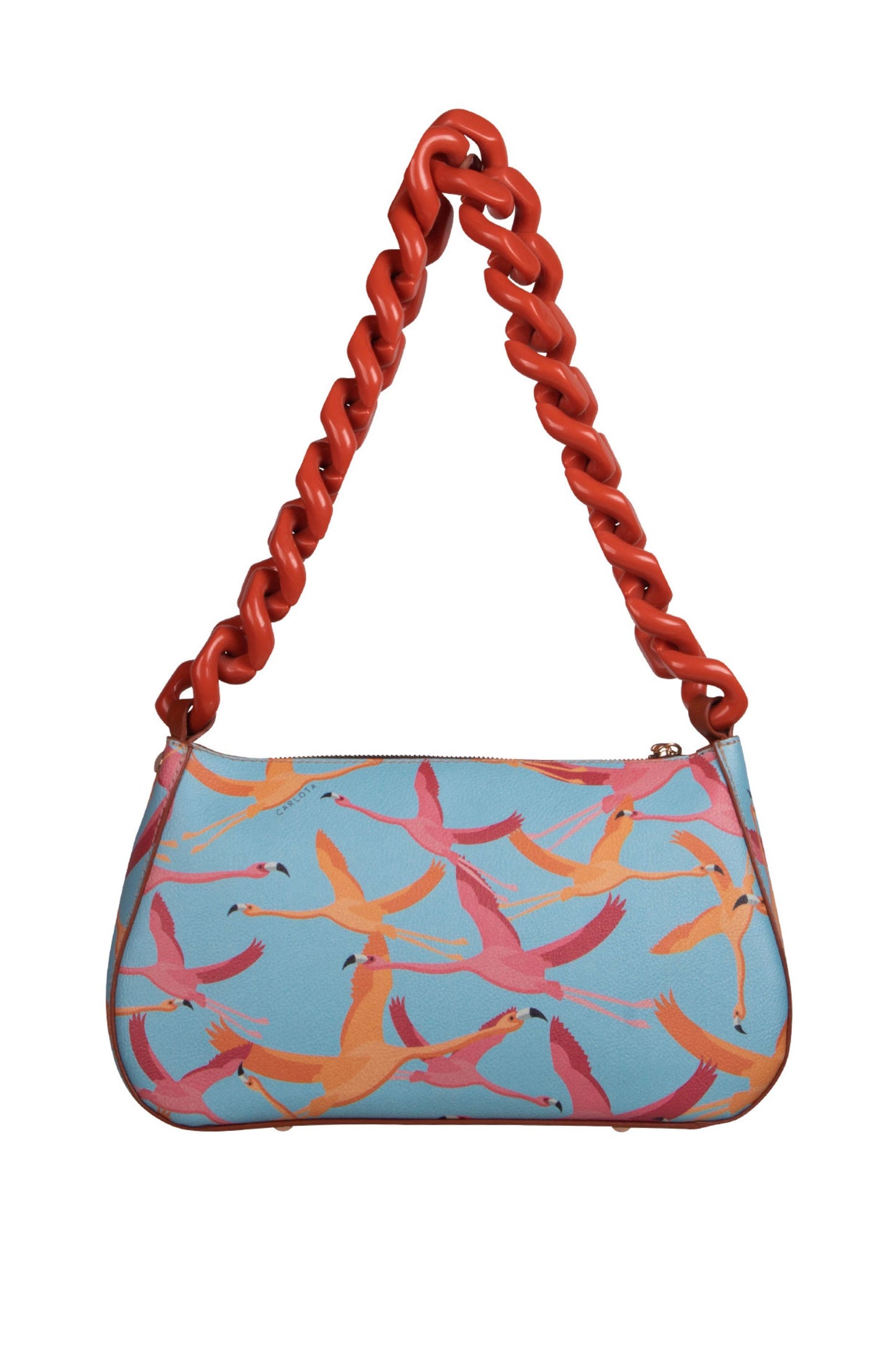 This classic baguette silhouette is compact yet spacious design perfect for the modern woman on the go. From day to night, the bag effortlessly complements your style, making a subtle yet sophisticated statement. The thoughtful design extends to the practical details. A secure zipper closure keeps your belongings safe, while the interior pockets provide convenient organization. Featuring a short acrylic chain handle in a bold orange hue, this bag is a true fashion statement. Gold details add a touch of sophistication and luxury, completing its elegant design. The baguette shoulder bag is not just a fashion statement but a practical and reliable companion for your daily adventures.