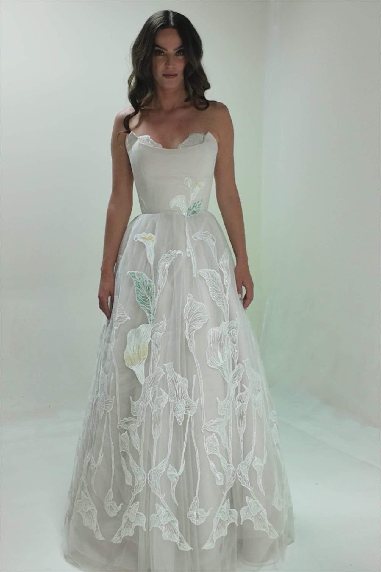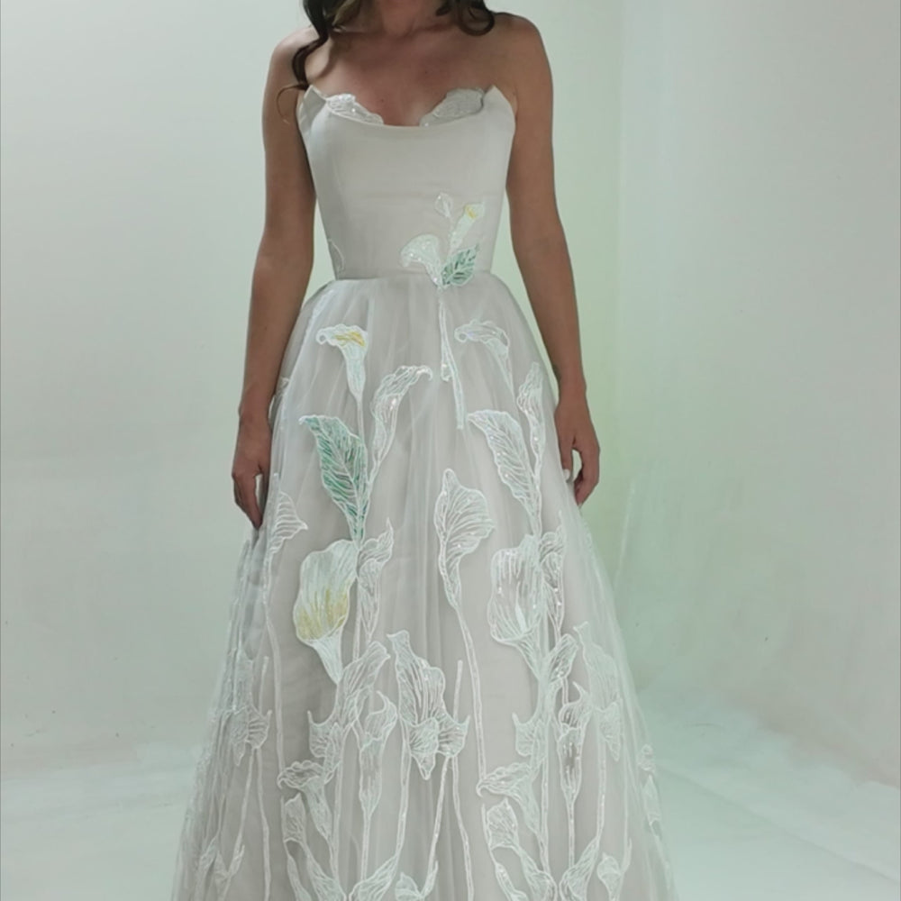 The full, double-circle skirt is crafted from layers of bridal tulle embroidered with luminous sequins and delicate calla lilies. Each flower begins with industrial embroidery for structure, then comes to life through hand-formed detailing in cotton thread—adding dimension, texture, and a touch of color to the center front. An adjustable lace-up back with eyelets and an invisible zipper allows for a secure, customizable fit. Crinoline is included for gentle volume and graceful movement.