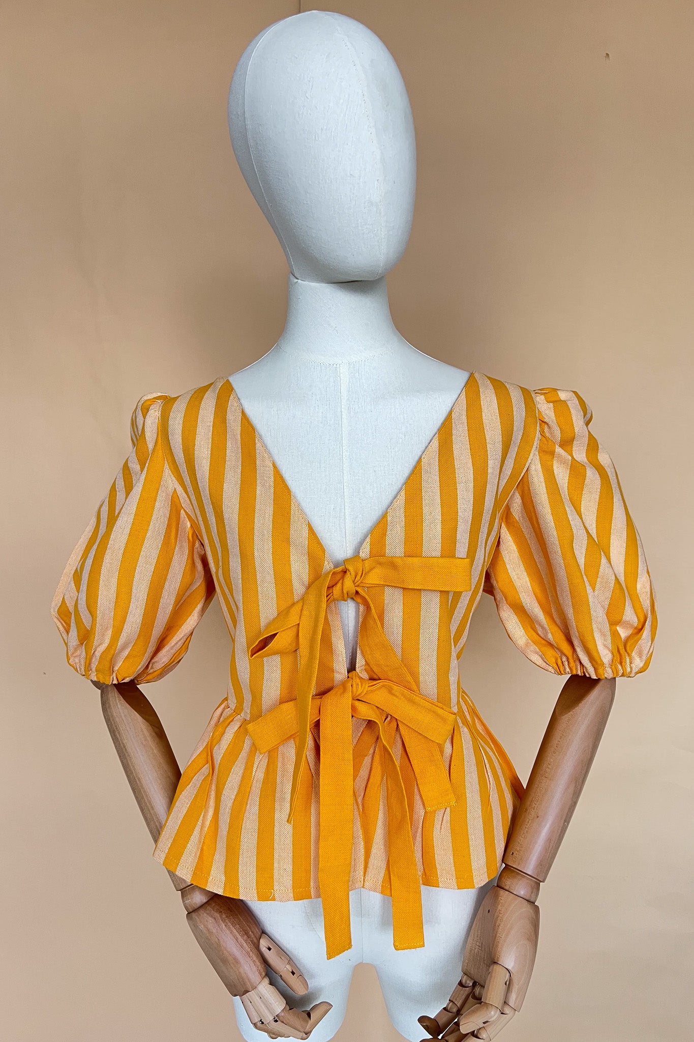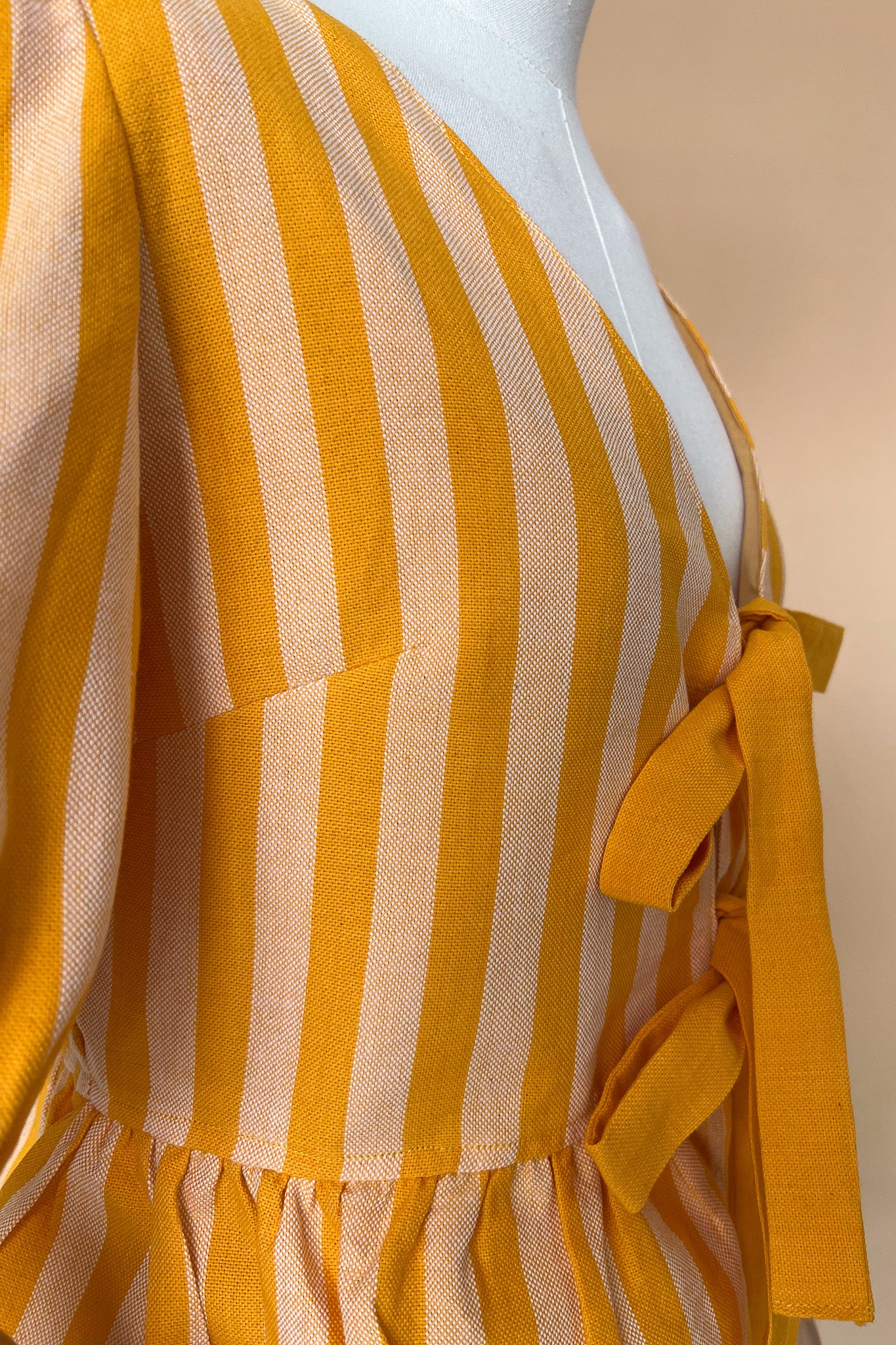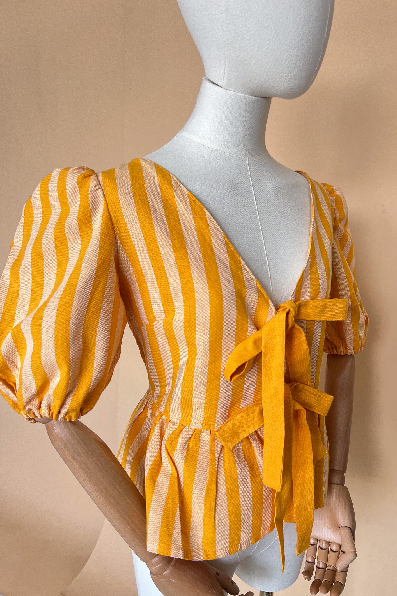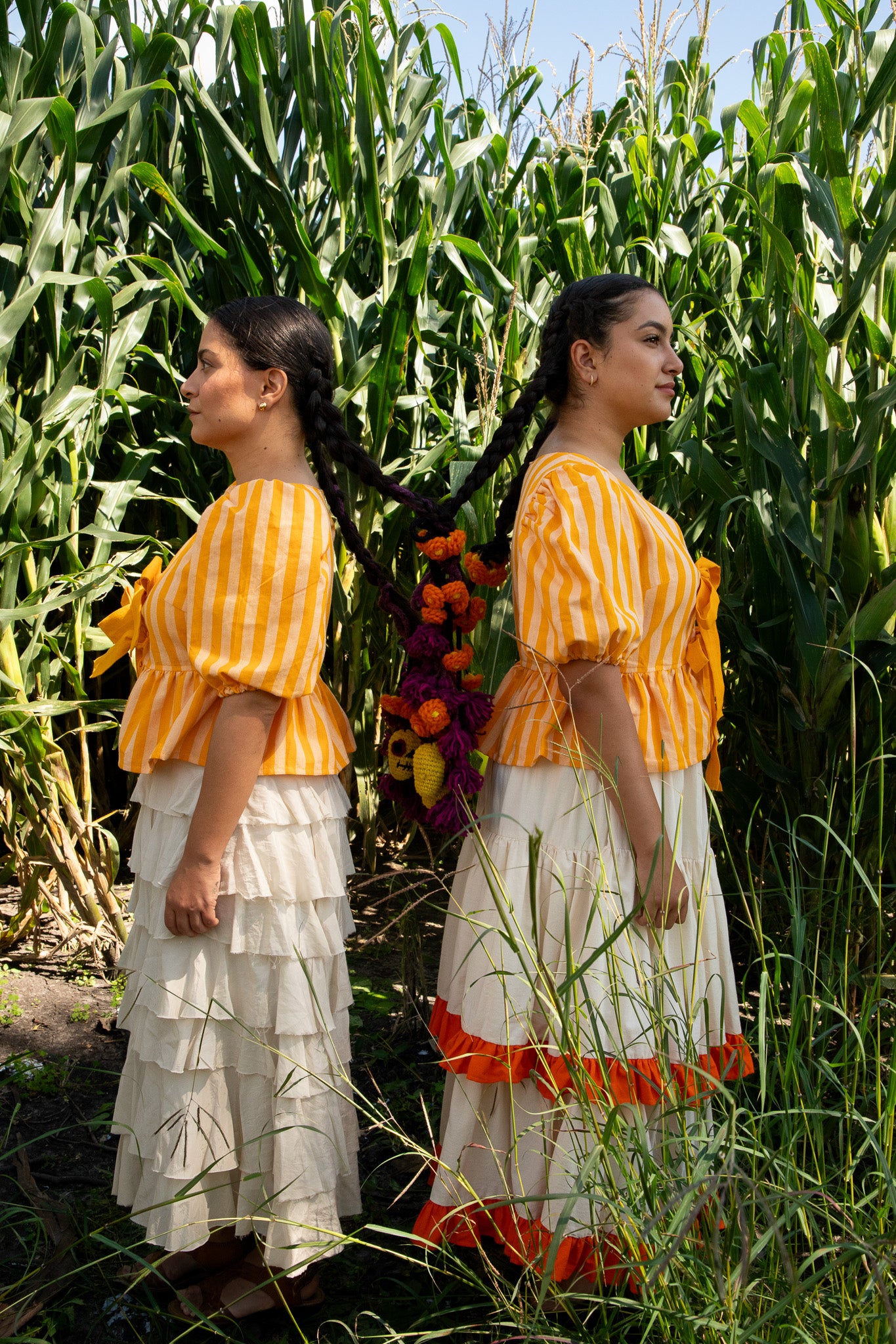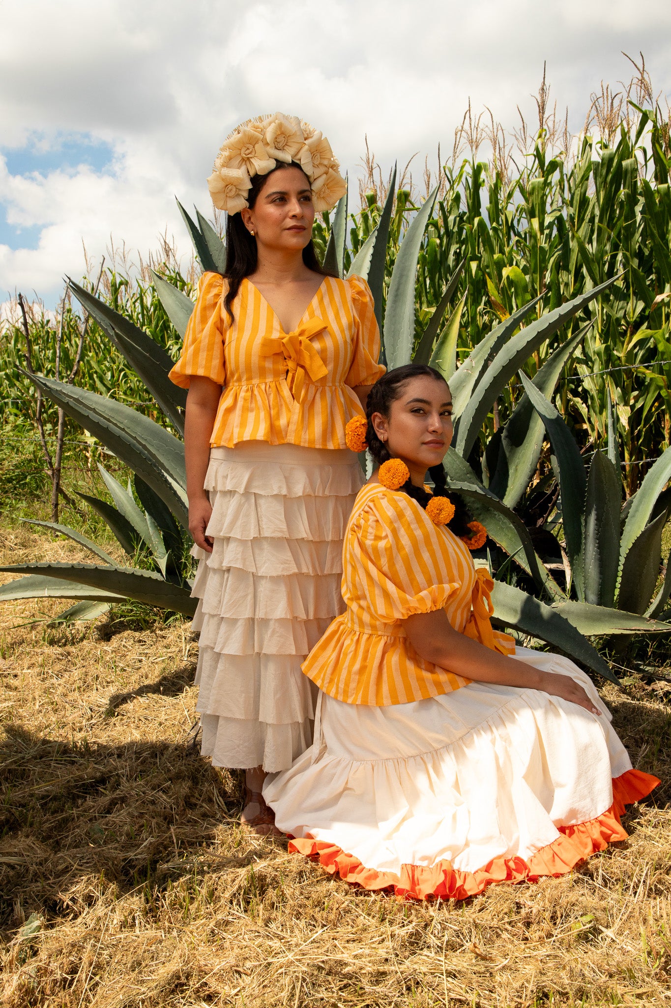 The cempasúchil flower, also known as the marigold, is a central symbol of Día de los Muertos, representing remembrance and the connection between the living and their ancestors. It is believed that the vibrant colors and fragrance of the cempasúchil guide spirits back to their loved ones during the holiday. The top features three front ties for a secure fit and a flattering peplum style that accentuates the silhouette.