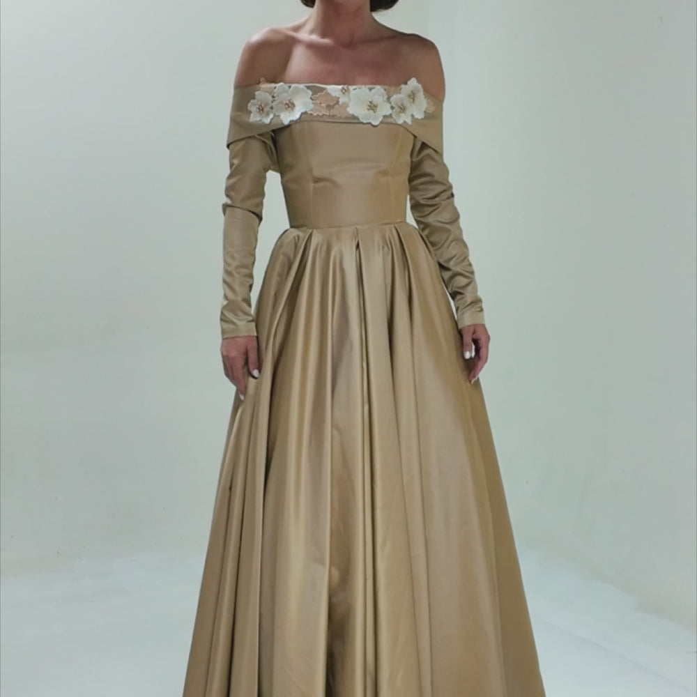 The structured bodice features a straight neckline adorned with hand-applied floral appliqués and gold pearl accents, offering both elegance and delicacy. Optional removable sleeves allow for a customizable look. A voluminous double-circle skirt flows with every step, while crinoline enhances structure and movement. Hidden side pockets offer a practical, modern touch. The back features eyelet closures and a flowing chiffon tie for a secure, graceful fit. Combining traditional craftsmanship with contemporary design, this gown offers a golden-hued moment of beauty—perfect for marking love stories that continue to shine.