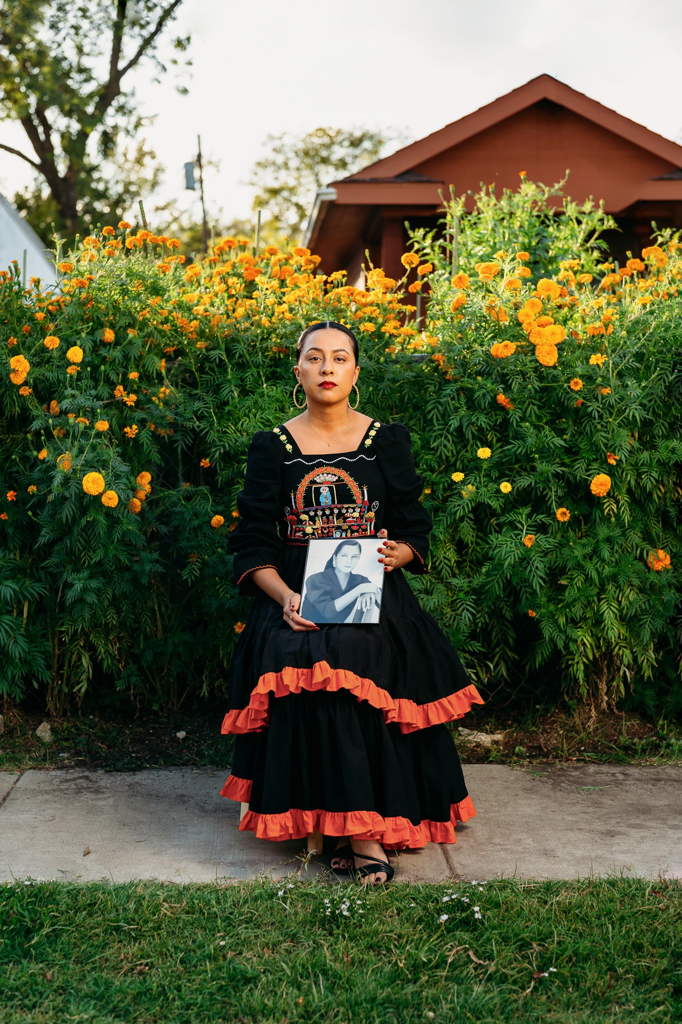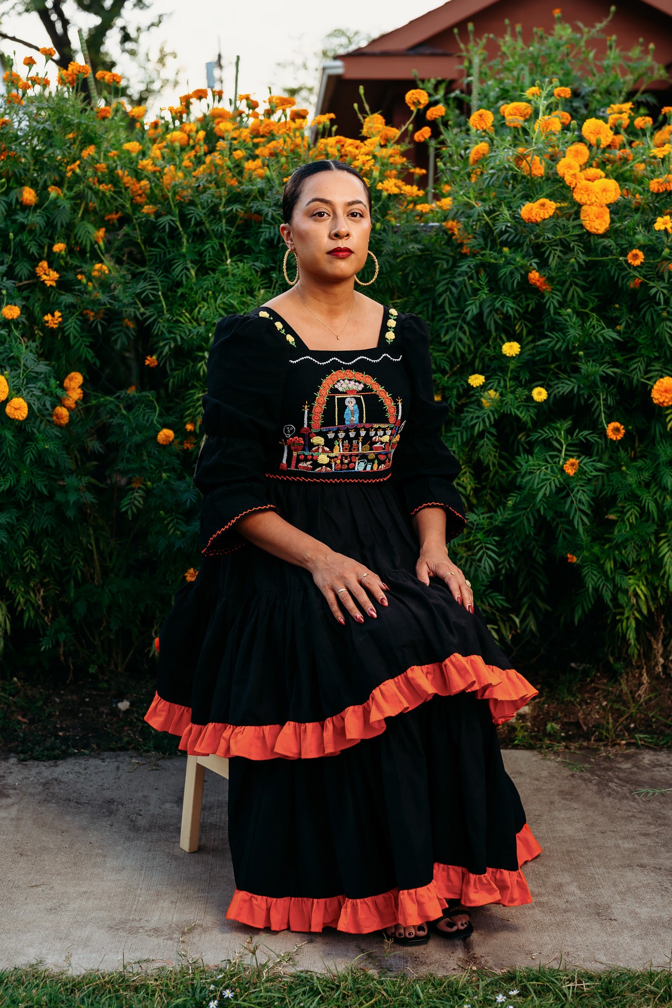 Tsanda is known for embroidering stories into fabric and creating custom pieces that capture personal histories with care and artistry. This particular design arose from a desire to honor loved ones, especially for those who, for various reasons, cannot set up their own Día de Muertos altar. The 'Mi Altar' top was born from a deep wish to feel close to those who have passed, carrying their memory with the same reverence as an altar.