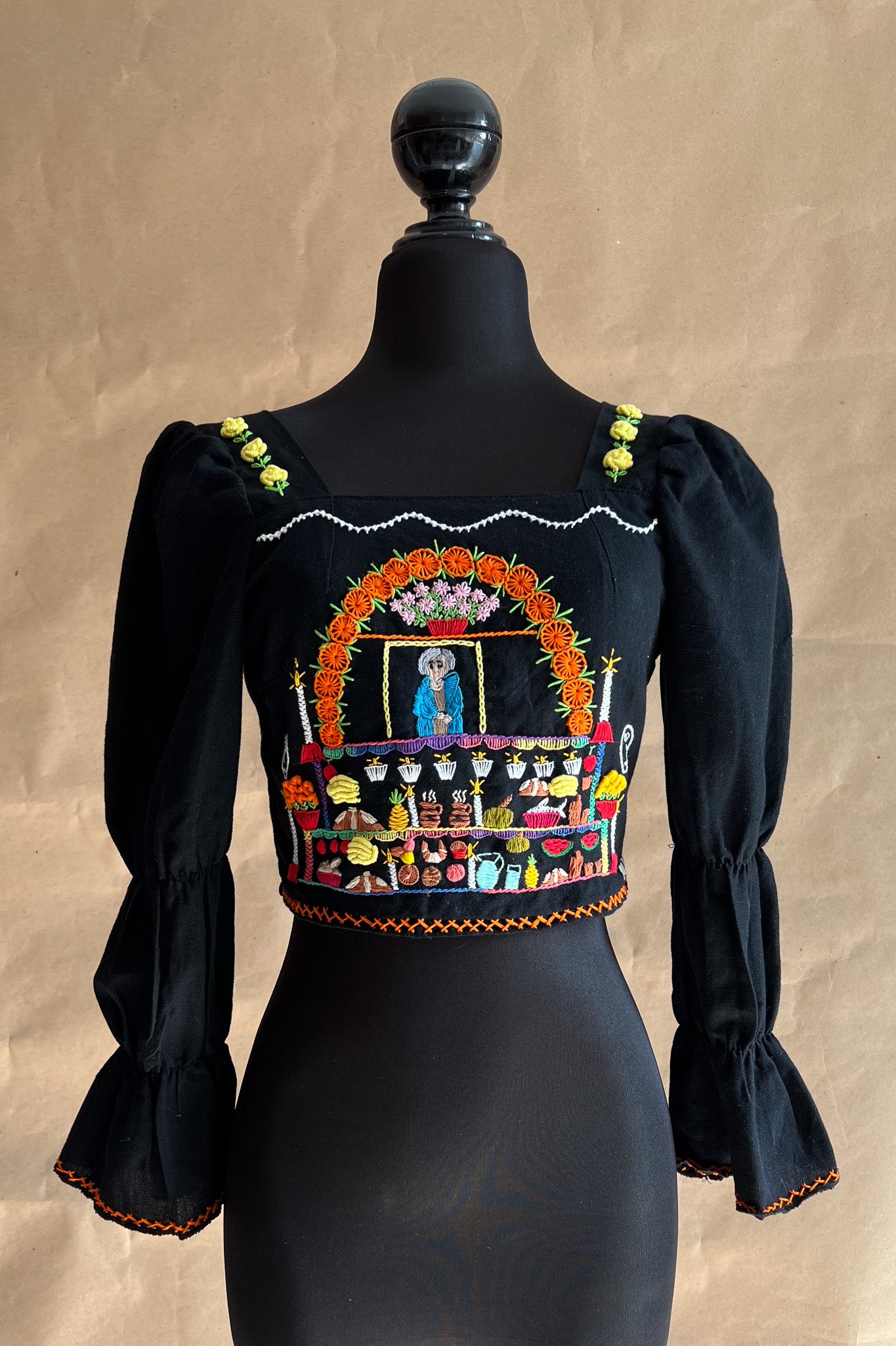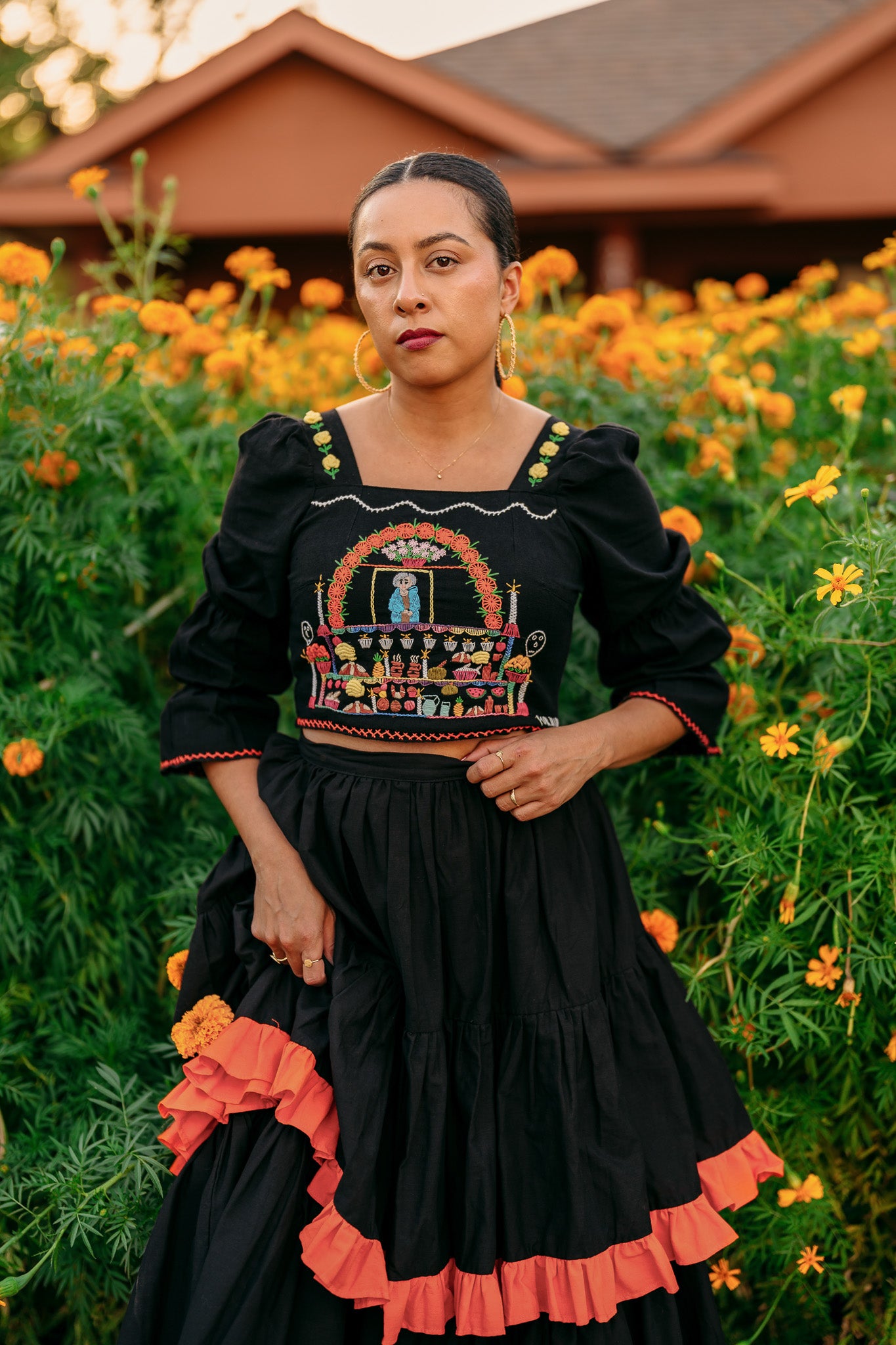 This top is inspired by the altars of Día de Muertos, a sacred observance deeply embedded in Mexican culture and rooted in Indigenous traditions. Celebrated on November 1st and 2nd, this time-honored event is not about mourning death, but about honoring life. Families gather to remember and celebrate their loved ones who have passed, recognizing that death is not the end, but a continuation of the soul’s journey.