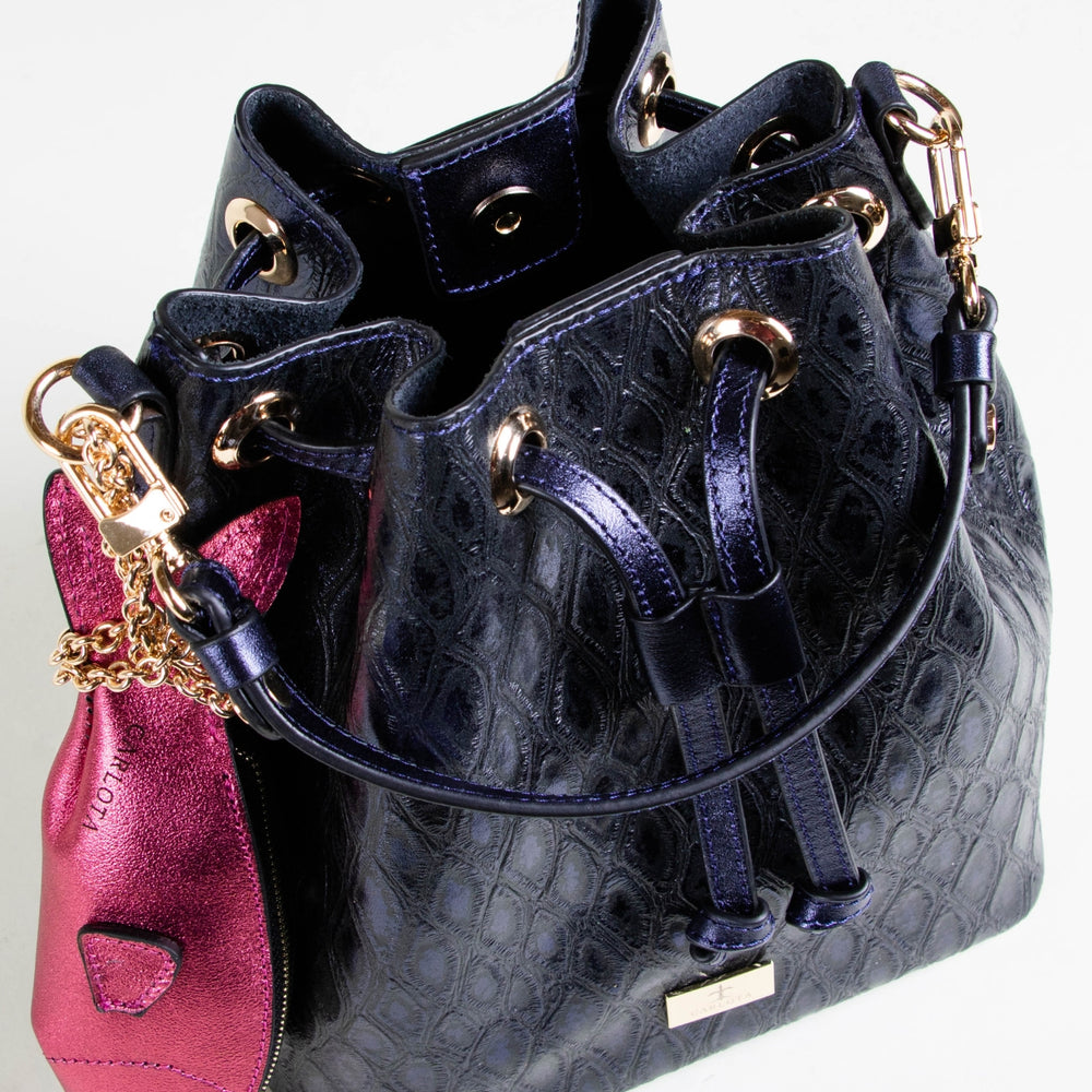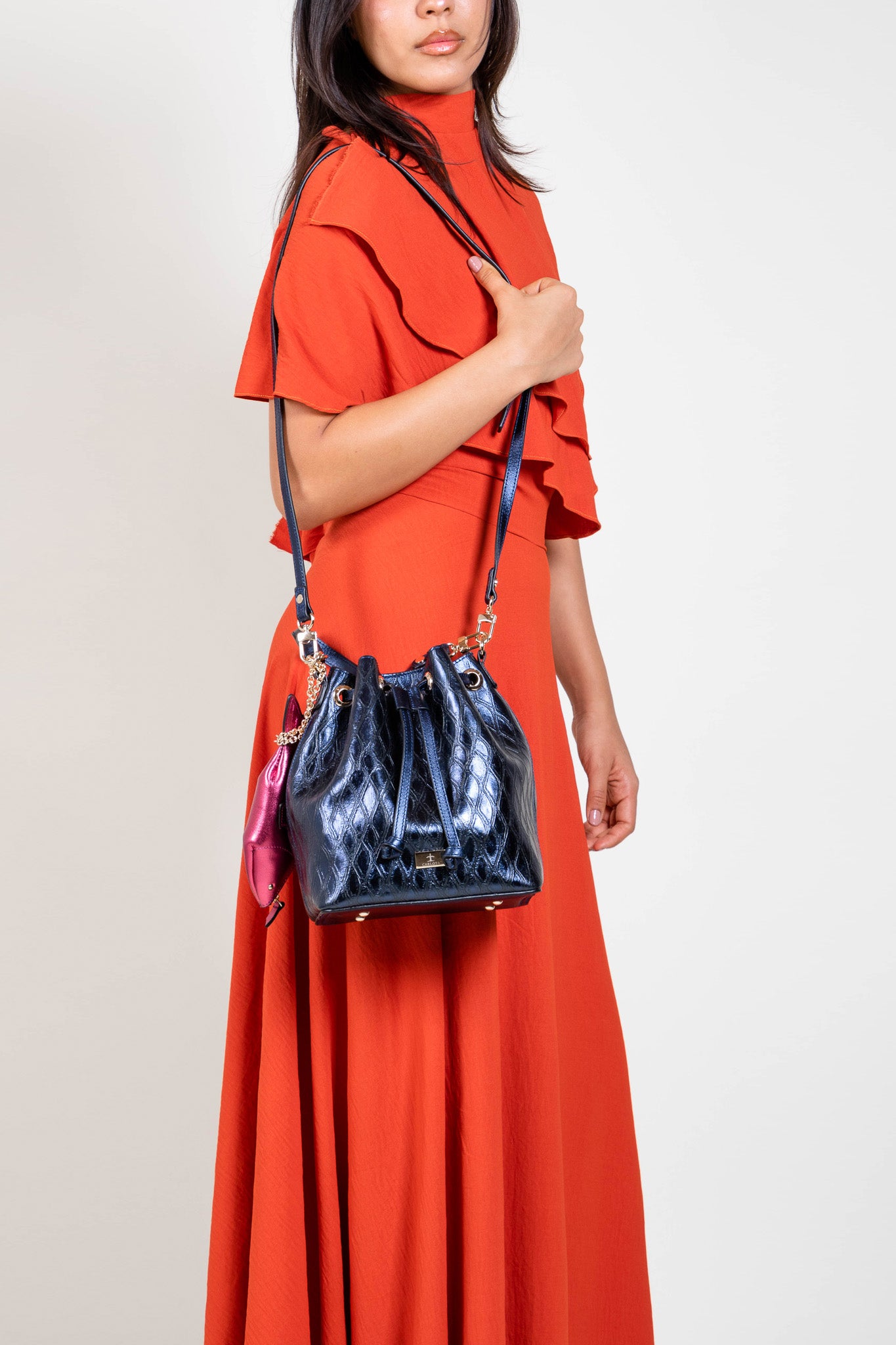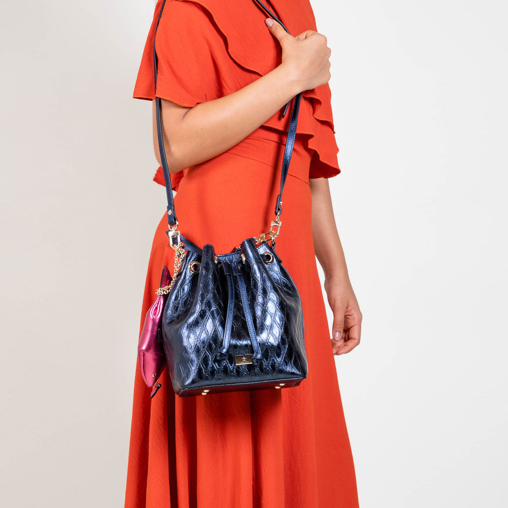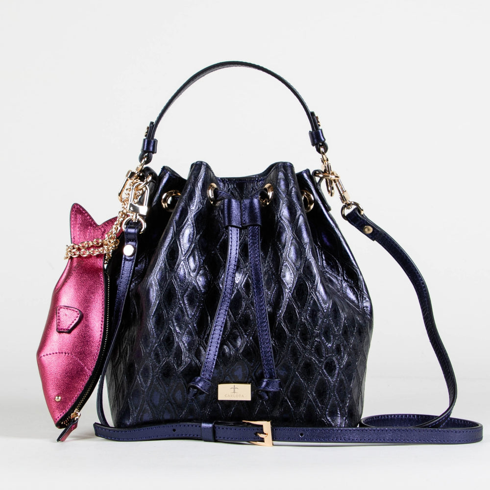 Inspired by El Pescado from the iconic Mexican lottery, this crossbody bag fuses heritage with contemporary design. Unconventional yet refined, this bucket bag reimagines a classic shape with a bold metallic finish and textured leather. Its roomy silhouette makes it an everyday essential while still standing out as a statement piece.