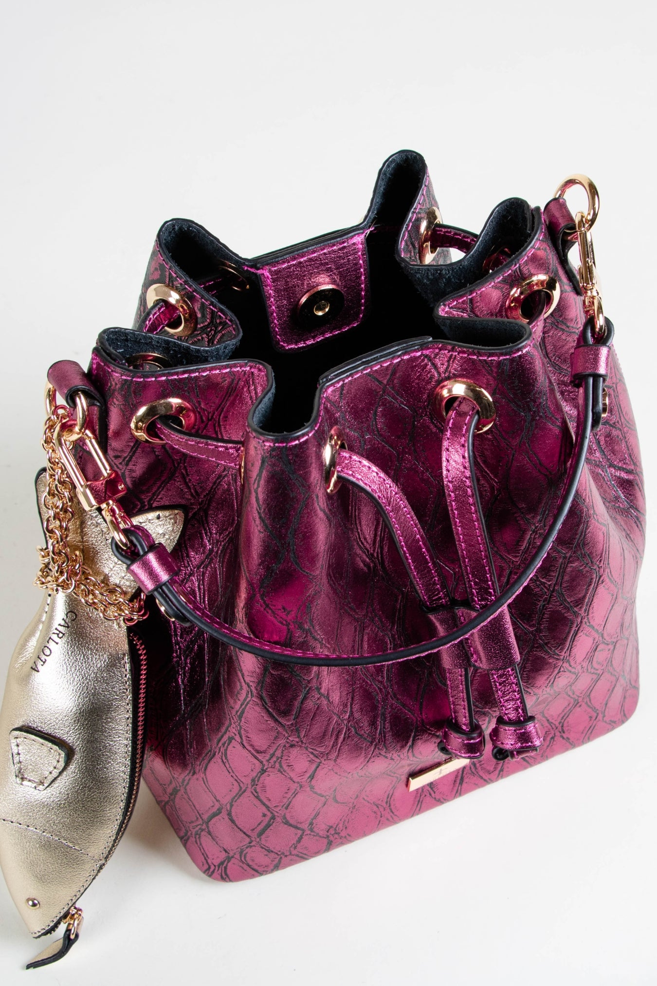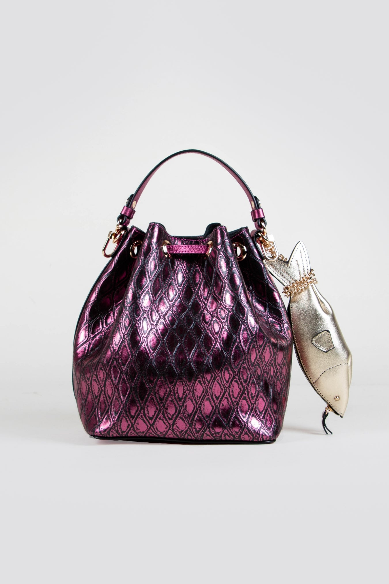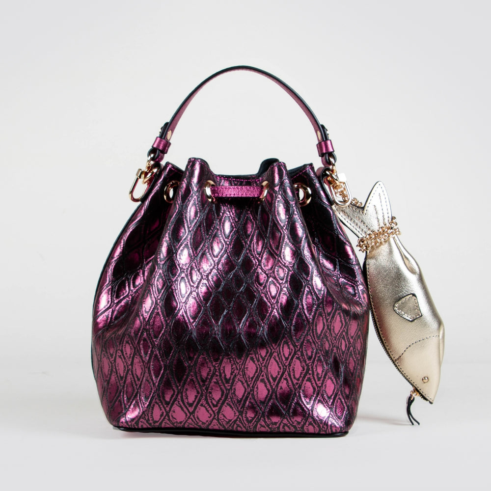 Inspired by El Pescado from the iconic Mexican lottery, this crossbody bag fuses heritage with contemporary design. Unconventional yet refined, this bucket bag reimagines a classic shape with a bold metallic finish and textured leather. Its roomy silhouette makes it an everyday essential while still standing out as a statement piece.