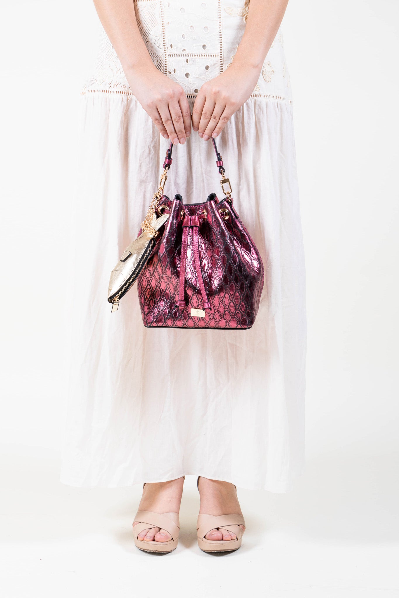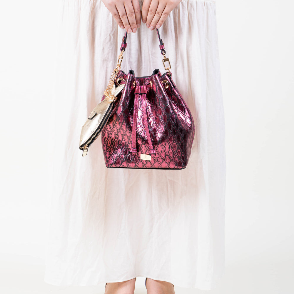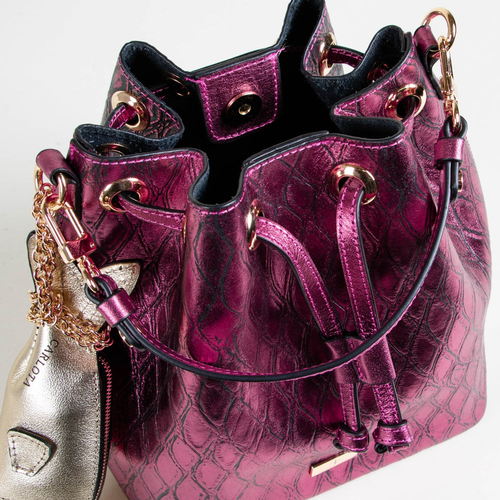 Inspired by El Pescado from the iconic Mexican lottery, this crossbody bag fuses heritage with contemporary design. Unconventional yet refined, this bucket bag reimagines a classic shape with a bold metallic finish and textured leather. Its roomy silhouette makes it an everyday essential while still standing out as a statement piece.