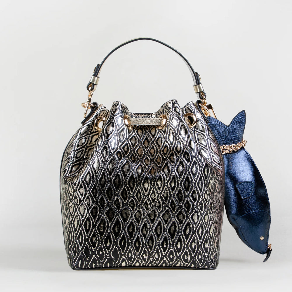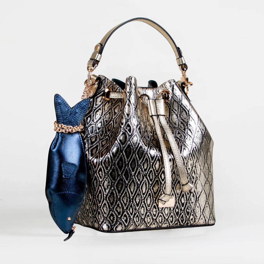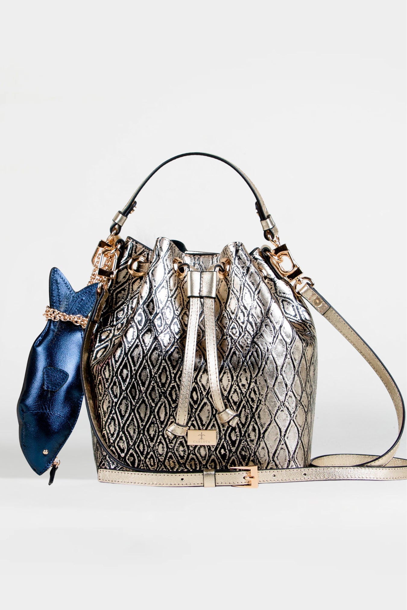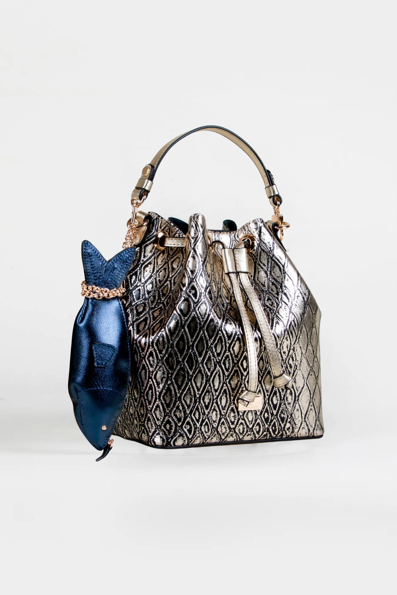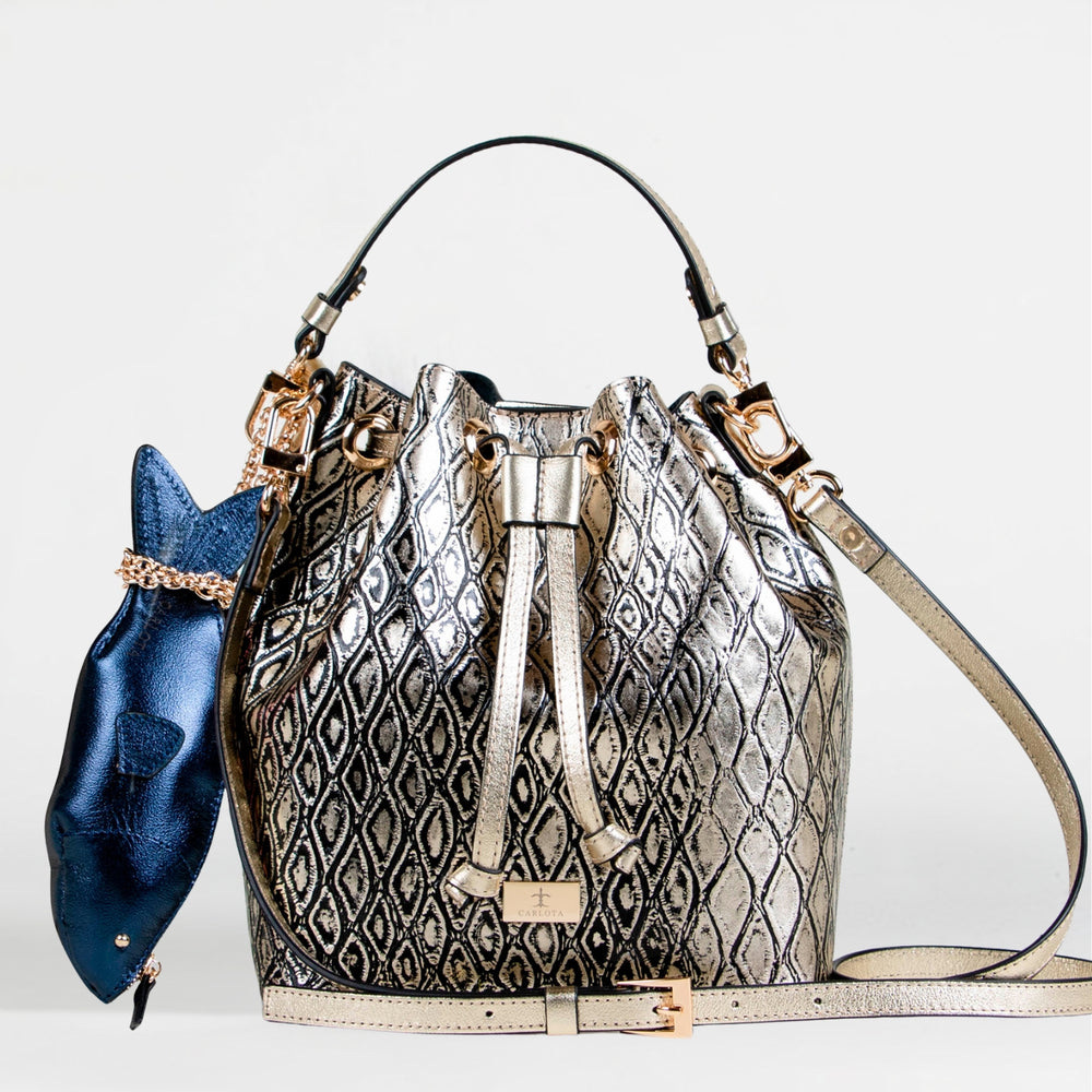 Inspired by El Pescado from the iconic Mexican lottery, this crossbody bag fuses heritage with contemporary design. Unconventional yet refined, this bucket bag reimagines a classic shape with a bold metallic finish and textured leather. Its roomy silhouette makes it an everyday essential while still standing out as a statement piece.