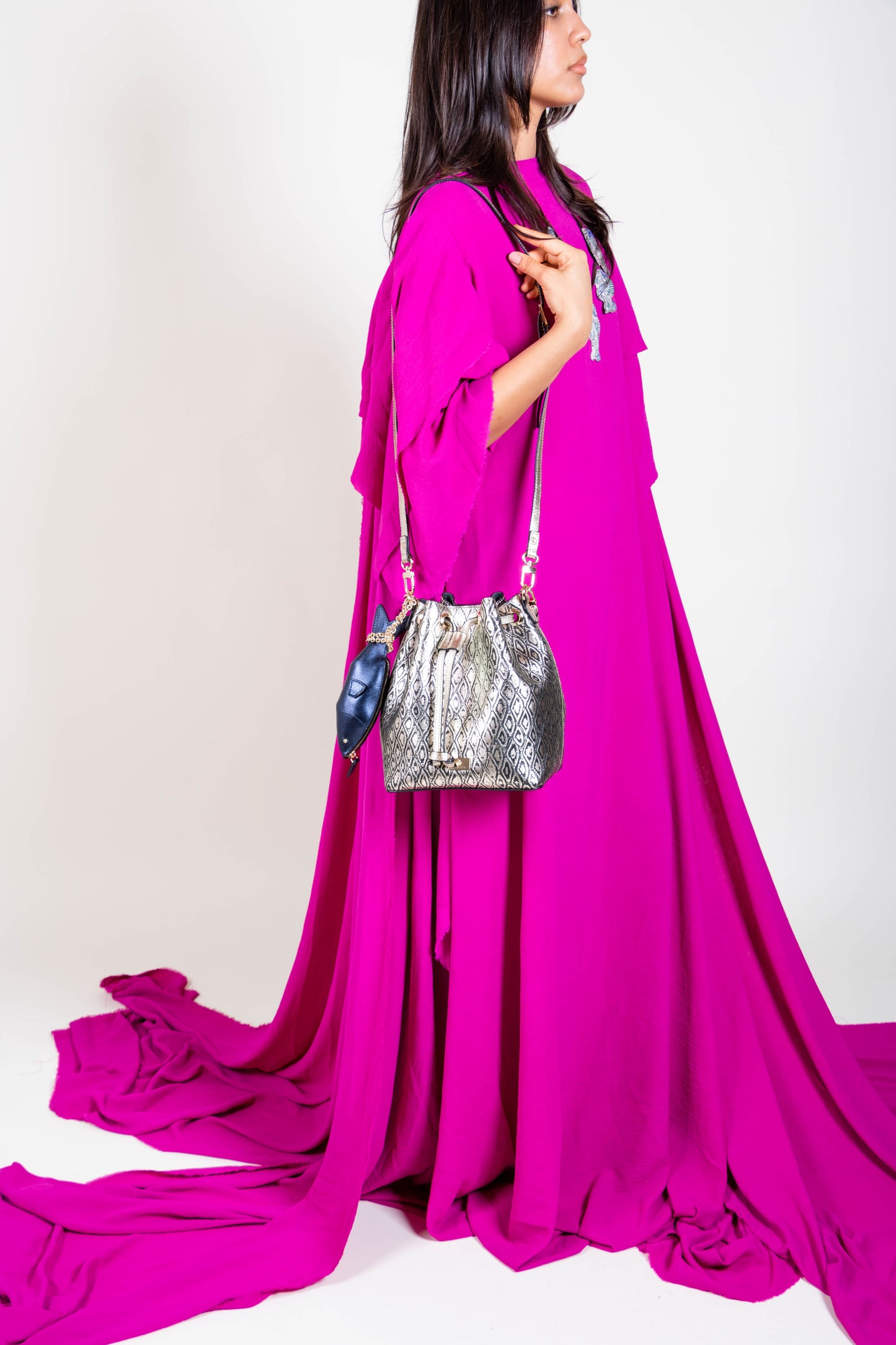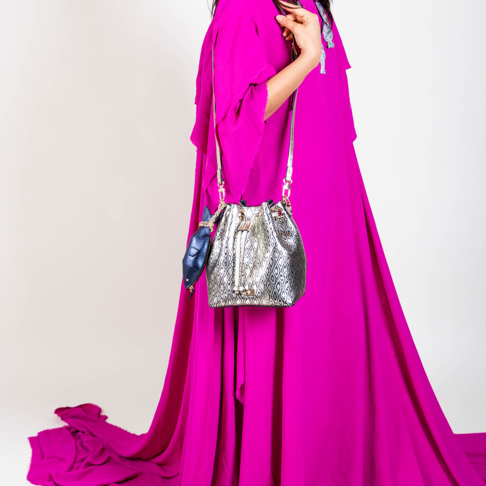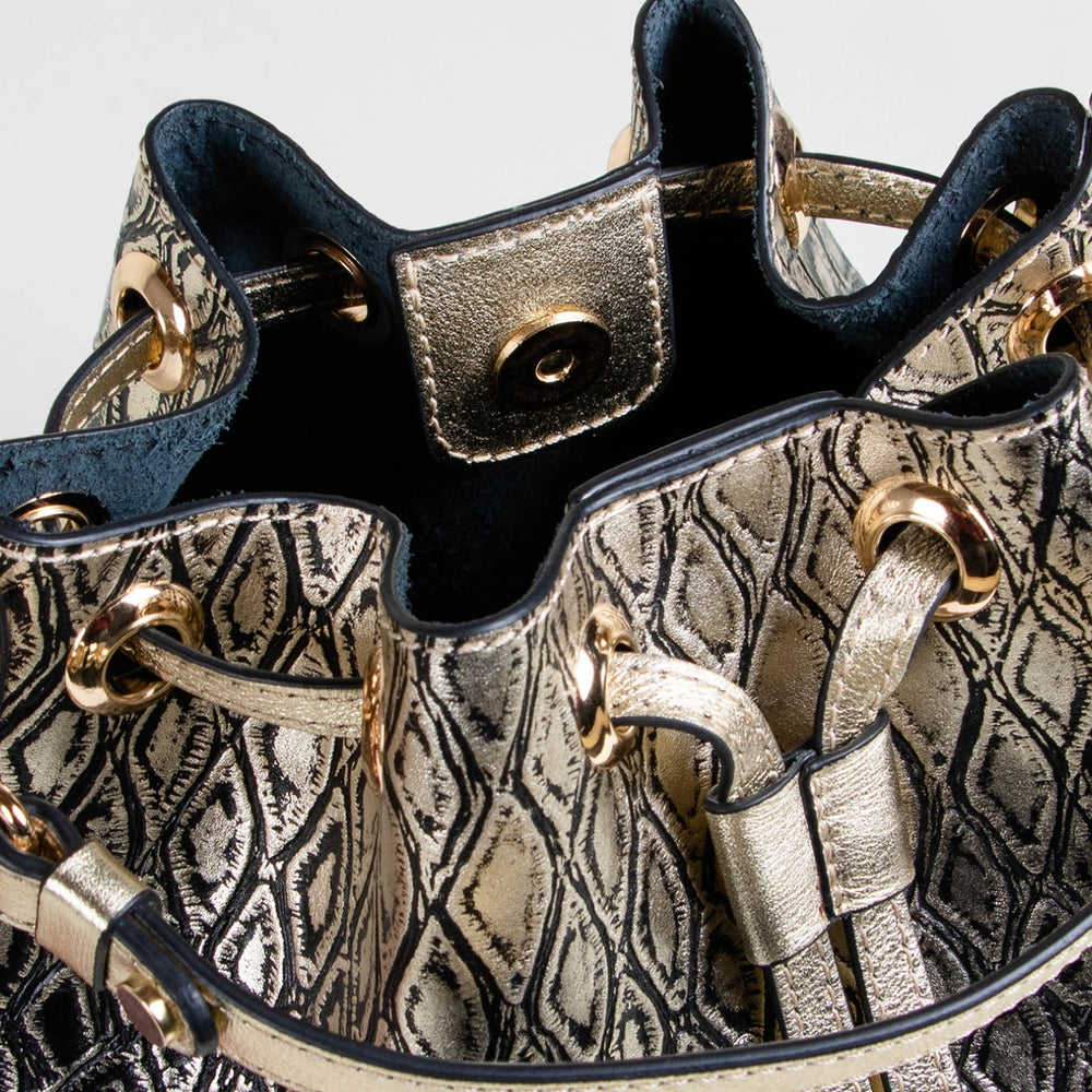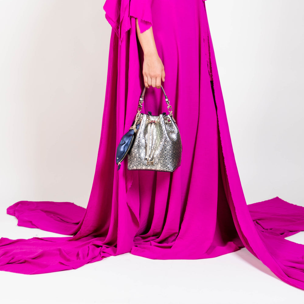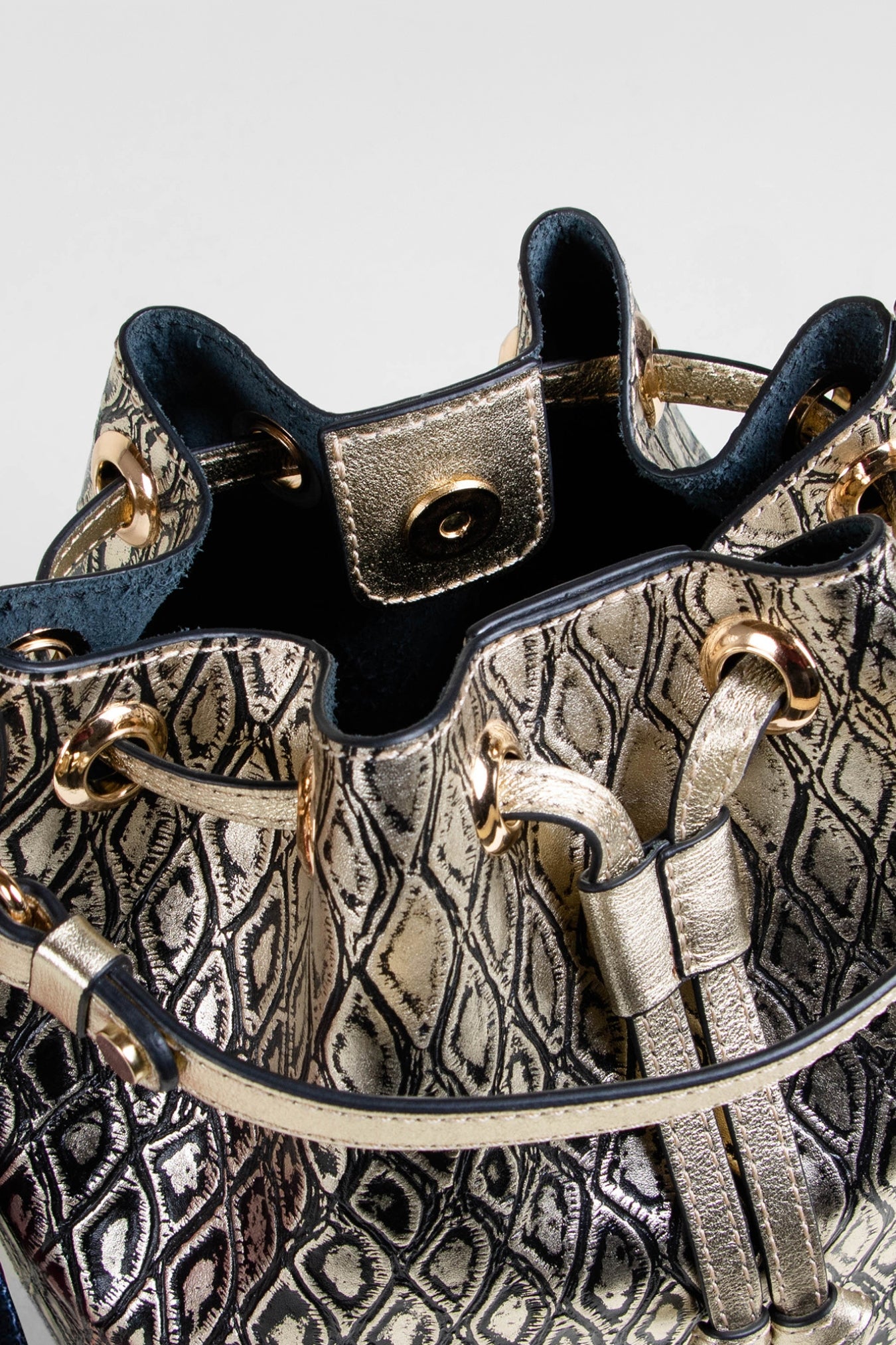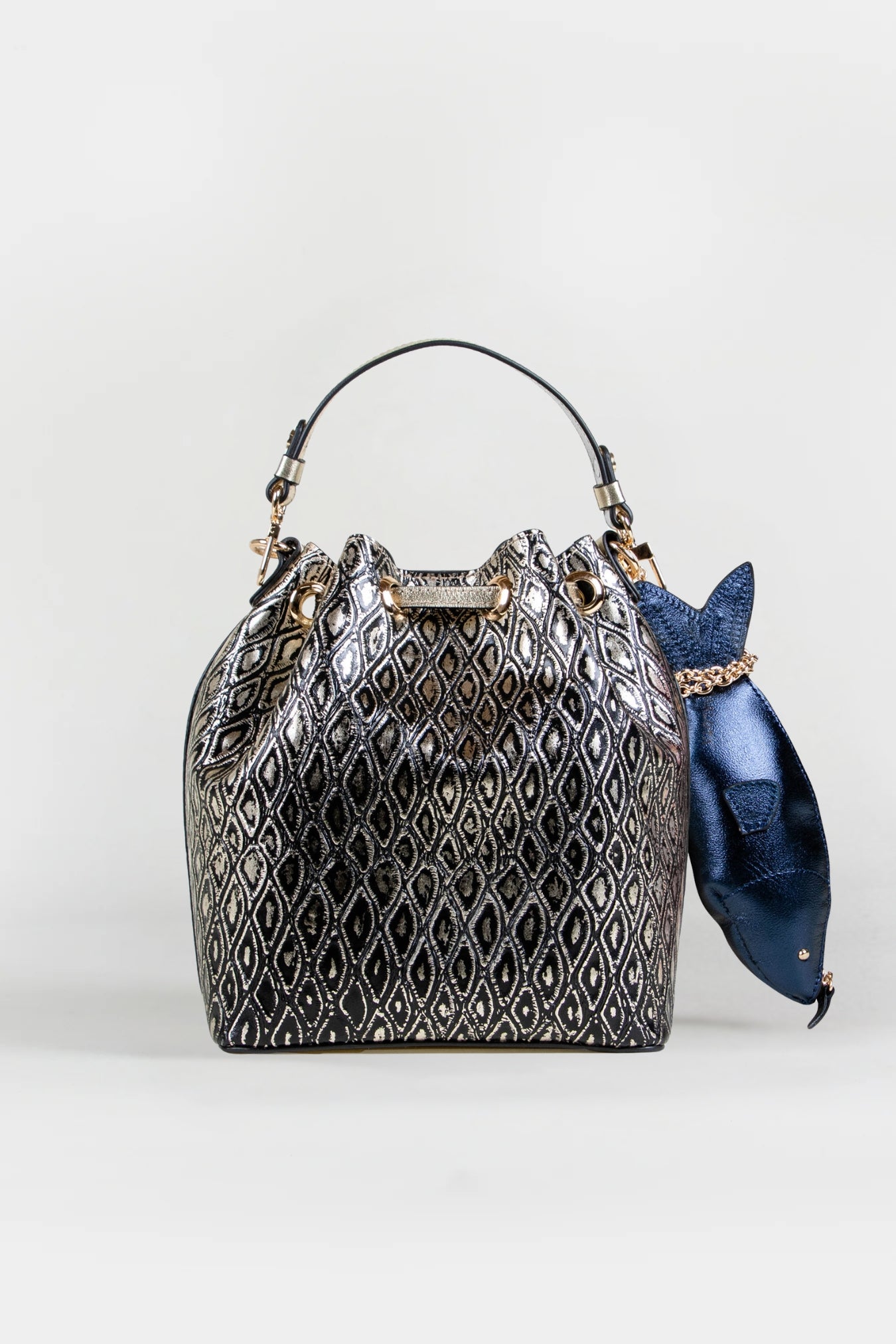 Inspired by El Pescado from the iconic Mexican lottery, this crossbody bag fuses heritage with contemporary design. Unconventional yet refined, this bucket bag reimagines a classic shape with a bold metallic finish and textured leather. Its roomy silhouette makes it an everyday essential while still standing out as a statement piece.
