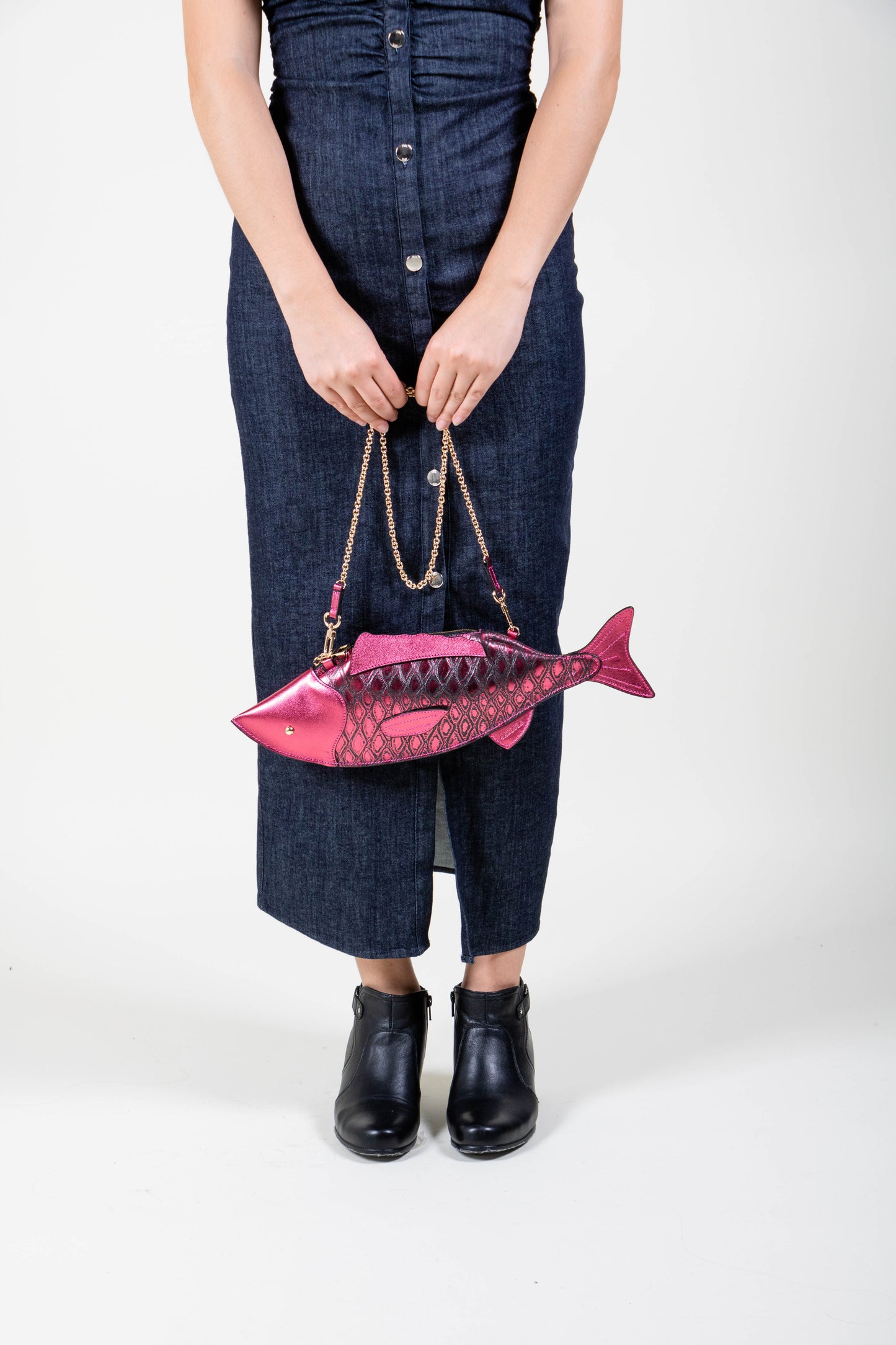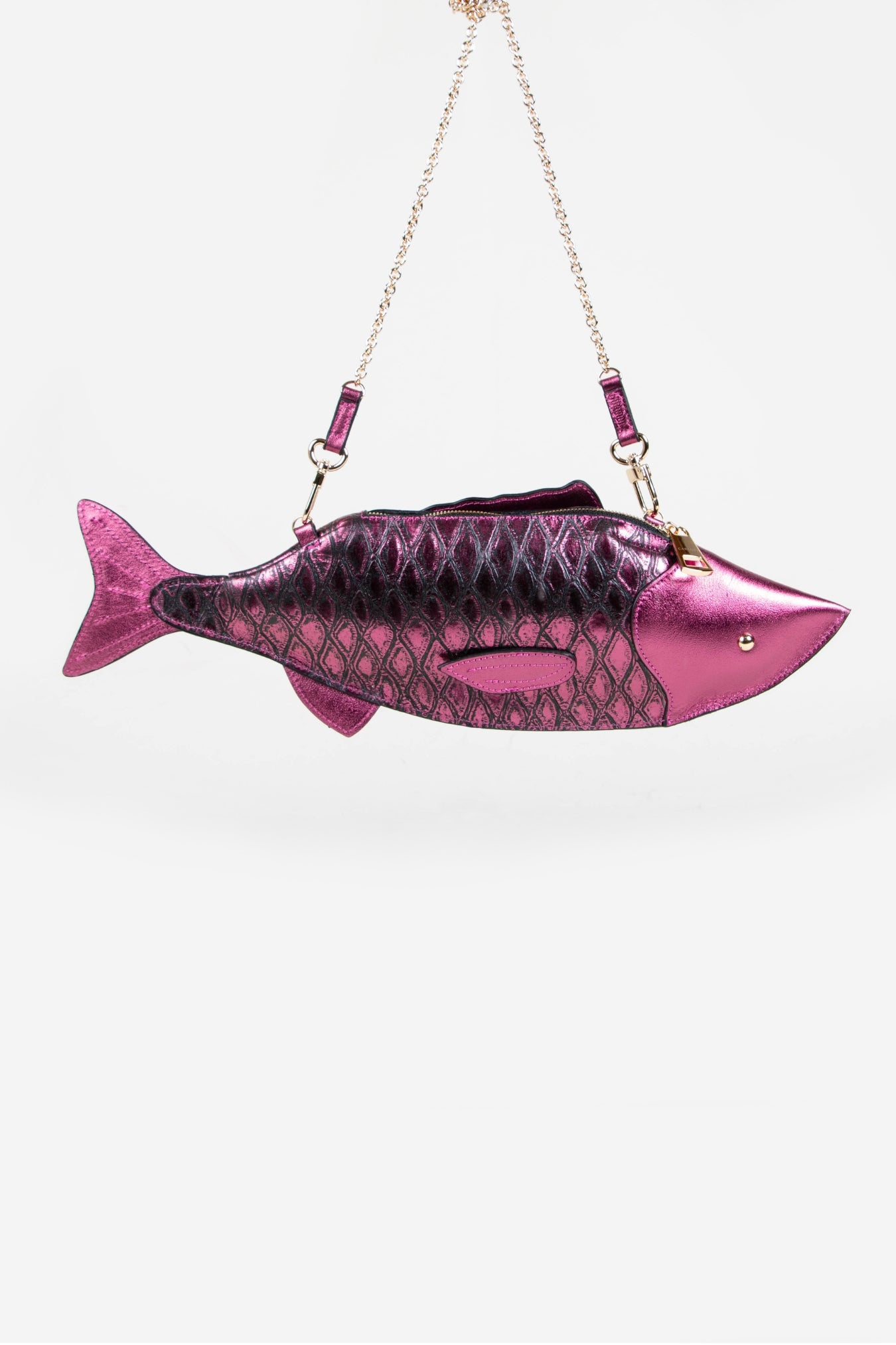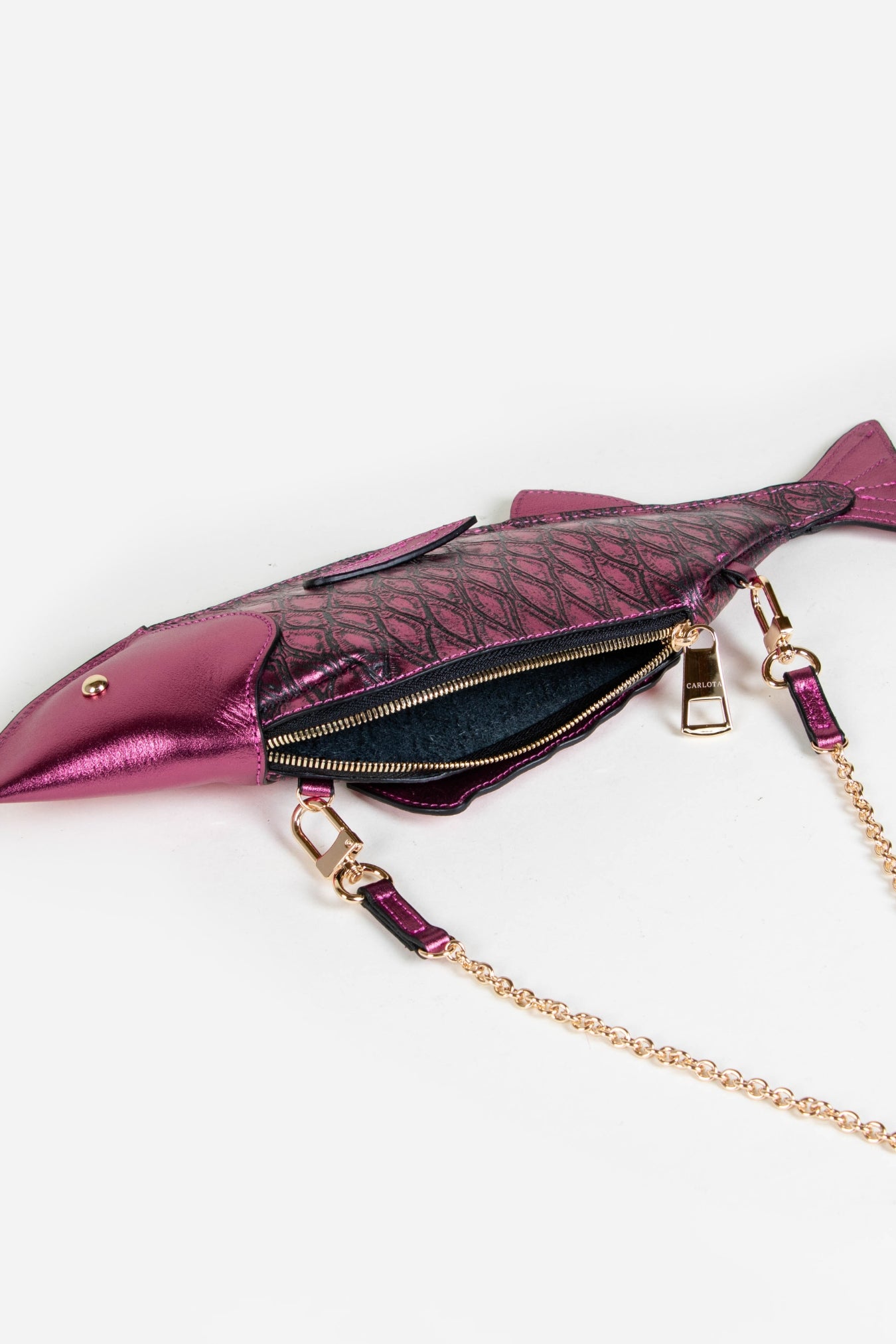 Inspired by El Pescado from the iconic Mexican lottery, this crossbody bag fuses heritage with contemporary design. Playful yet practical, this crossbody bag reimagines the classic silhouette through the sculptural form of a fish. With its metallic textured finish and whimsical design, it’s a standout accessory that fuses cultural storytelling with contemporary style.