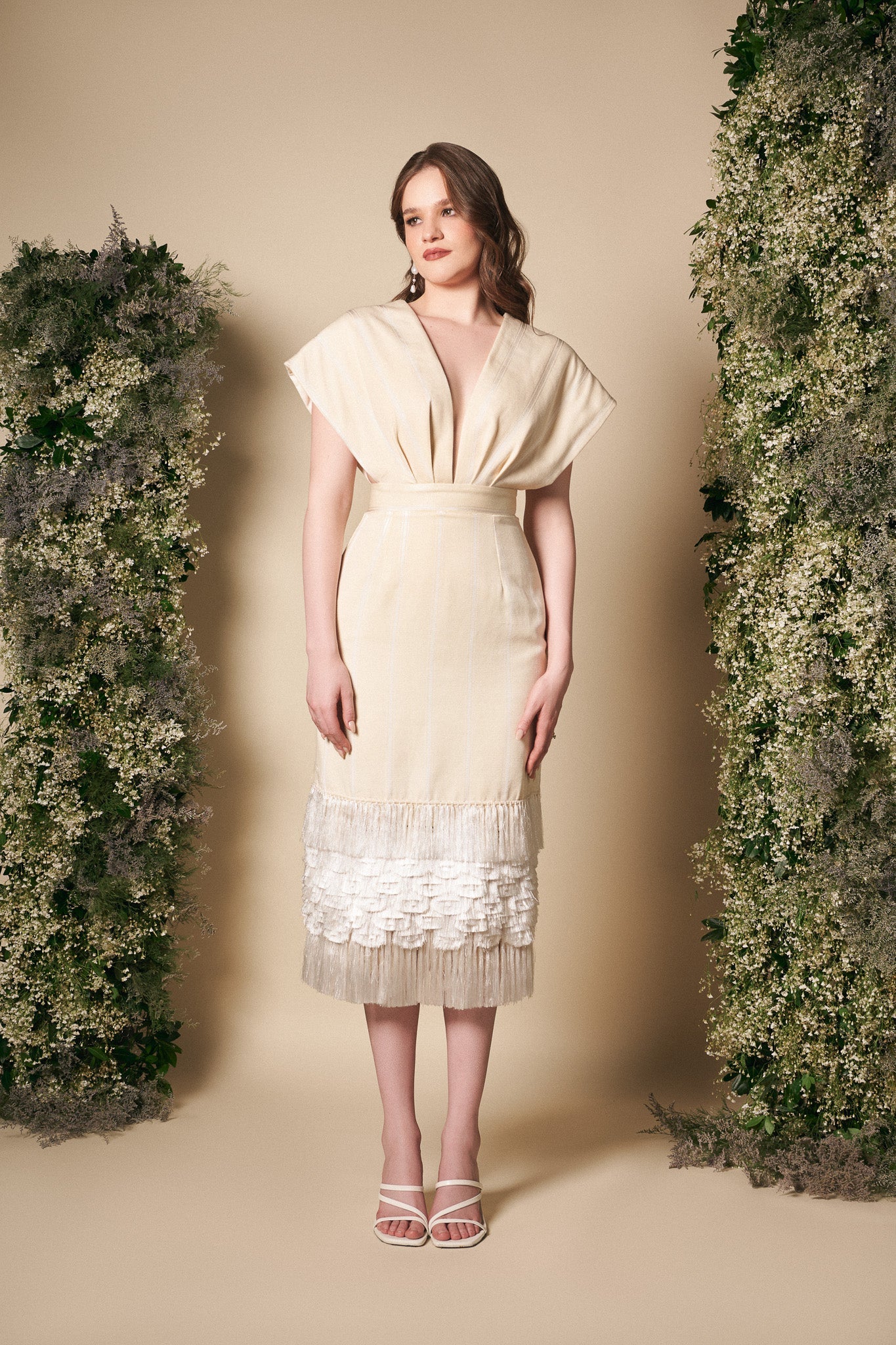 The silk loom dress is the epitome of artisanal craftsmanship! The fabric of this dress is a testament to the ancient art of weaving, created on a traditional backstrap loom using cotton and silk threads. The silhouette of the dress is both elegant and timeless, with a straight cut at the top that features a pronounced V neckline. A wide waistband at the waist enhances the figure, while the skirt falls in a basic pencil cut, accentuated by the delicate silk beards that cascade gracefully below the knee. At the back, an invisible zipper closure ensures a seamless finish, allowing the attention to remain on the gown's exquisite craftsmanship and intricate details.